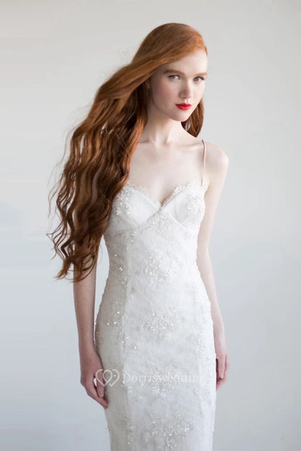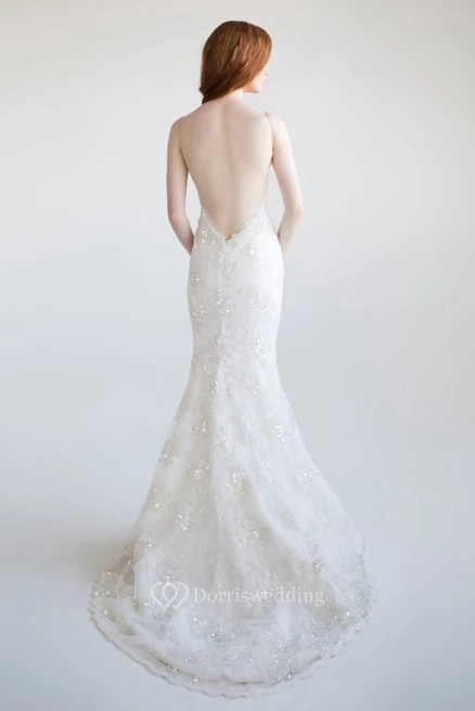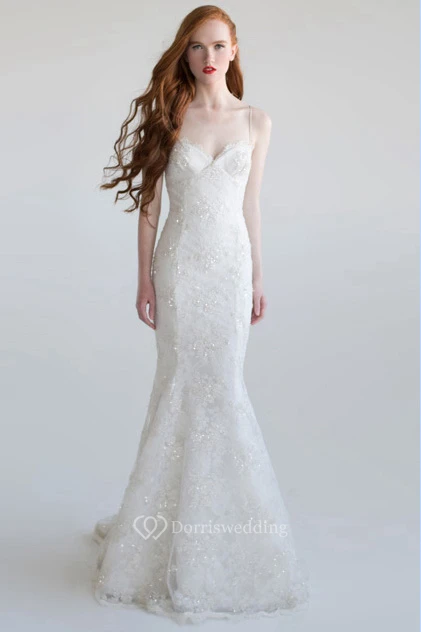 Trumpet Sleeveless Long Spaghetti Beaded Lace Wedding Dress With Appliques