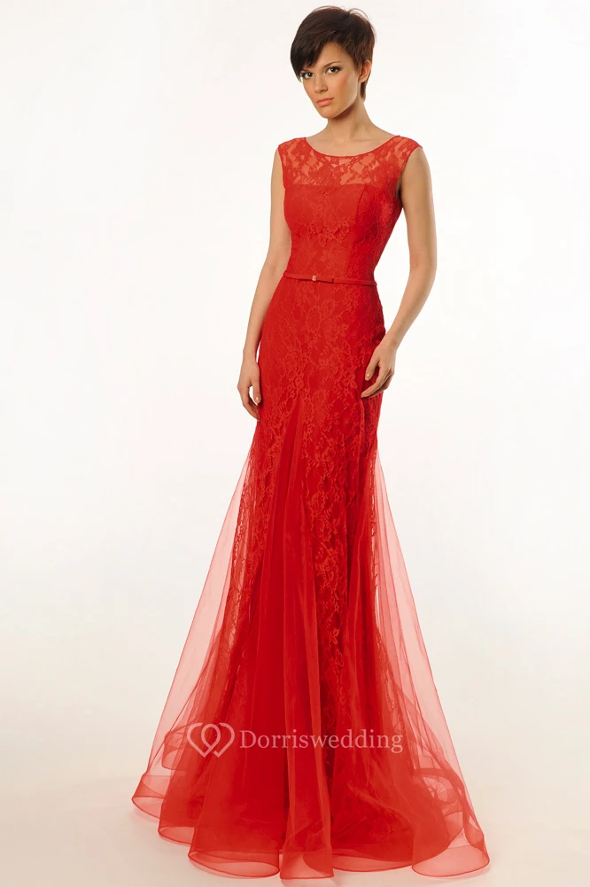 Trumpet Sleeveless Scoop Appliqued Floor-Length Lace&Tulle Prom Dress With Low-V Back And Ruffles
