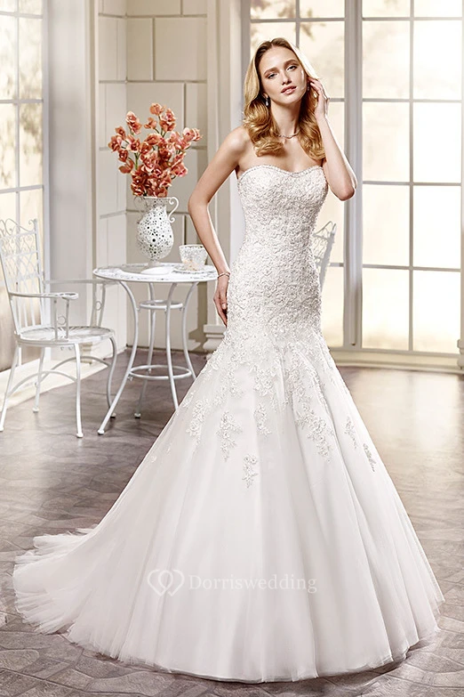 Trumpet Sweetheart Long Beaded Tulle Wedding Dress With Appliques