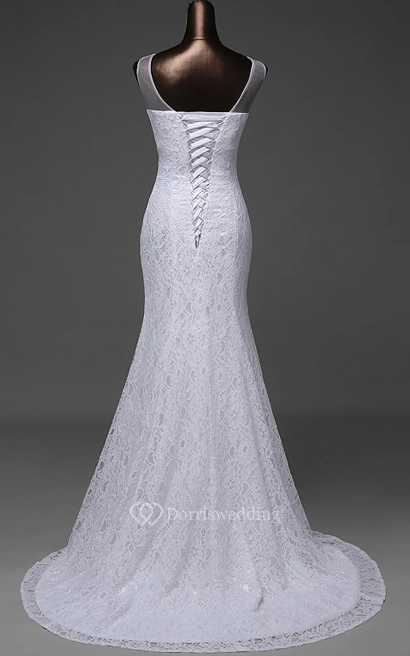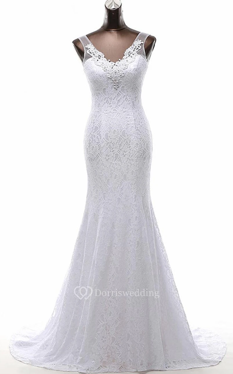 Trumpet Tea-Length V-Neck Sleeveless Beading Appliques Sweep Train Backless Lace-Up Back Lace Dress