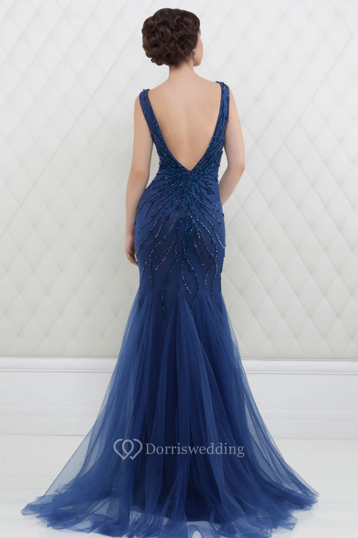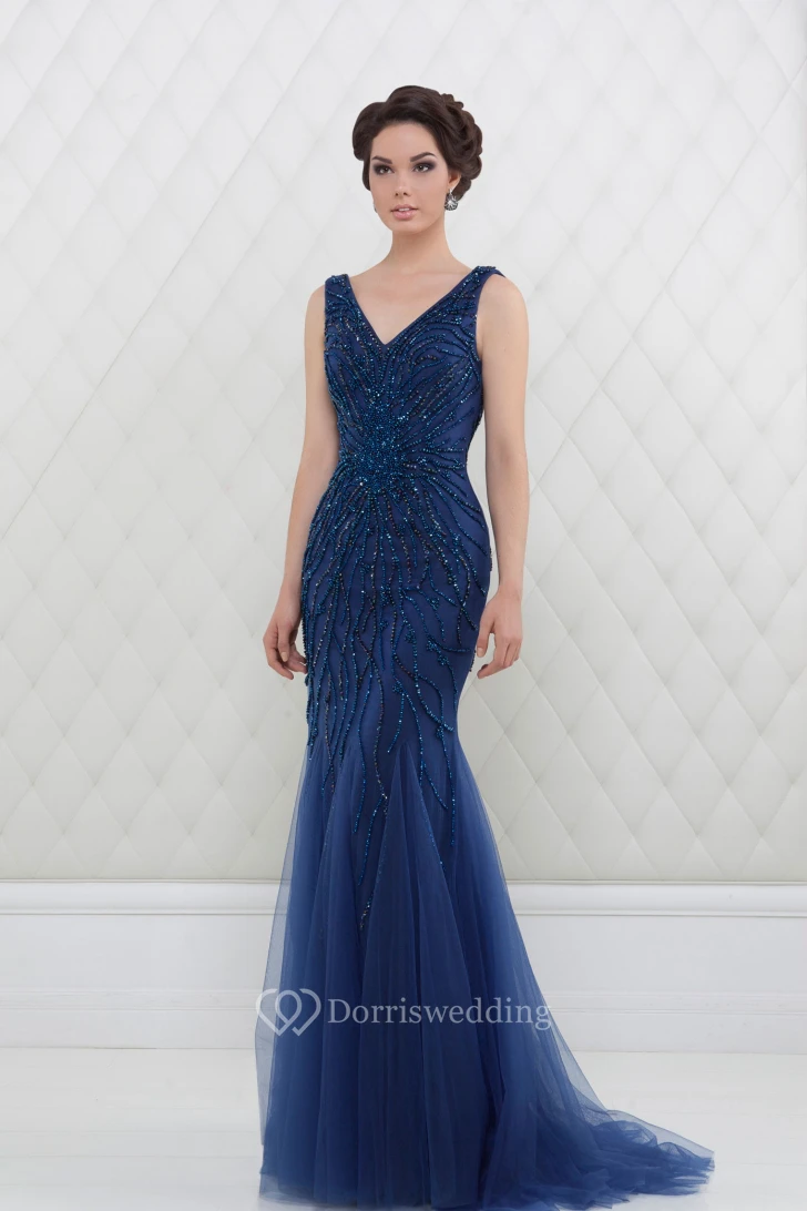 Trumpet V-Neck Beaded Long Sleeveless Tulle Prom Dress With Pleats