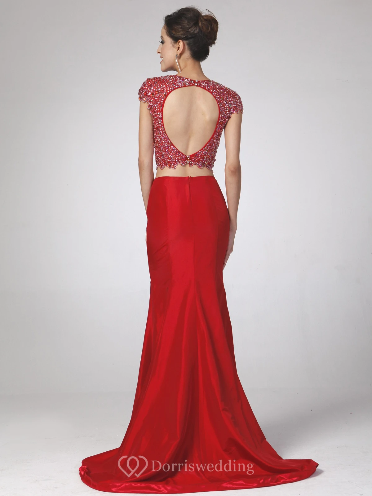 Trumpet V-Neck Cap-Sleeve Satin Keyhole Dress With Beading