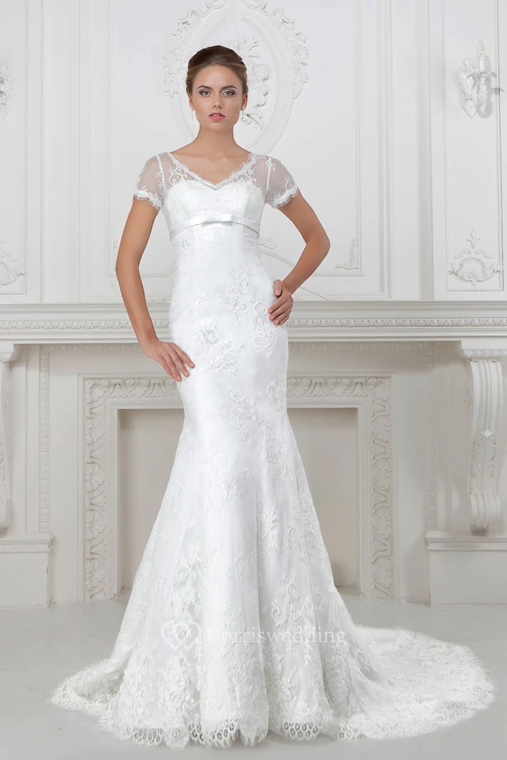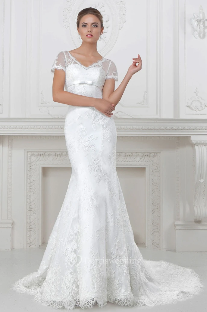 Trumpet V-Neck Short-Sleeve Appliqued Long Lace&Satin Wedding Dress With Waist Jewellery