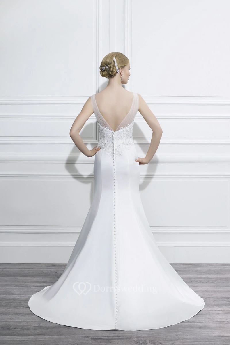 Trumpet V-Neck Sleeveless Floor-Length Appliqued Satin Wedding Dress With Brush Train And Low-V Back