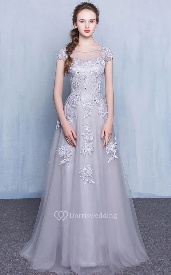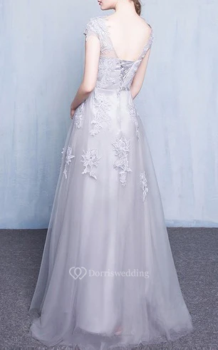 Tulle Floor-length A Line Short Sleeve Casual Prom Dress with Appliques