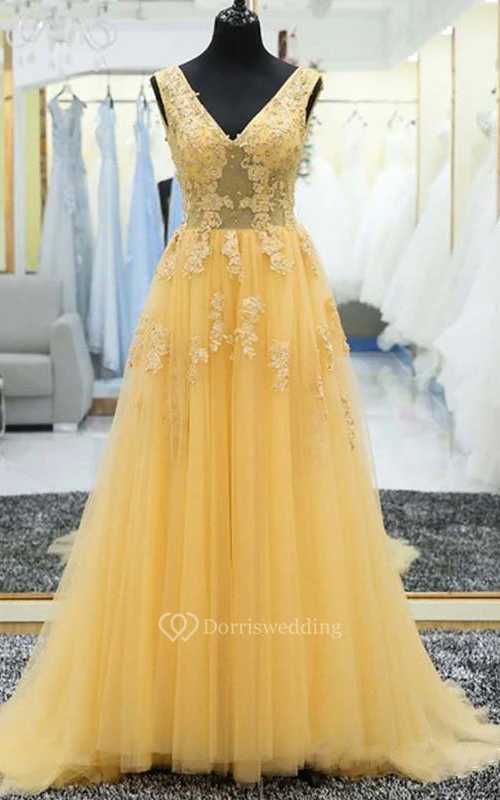 Tulle Floor-length Brush Train A Line Sleeveless Simple Prom Dress with Appliques