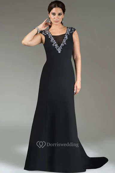 Tulle Neck Cap Sleeve A-Line Long Mother Of The Bride Dress With Train And Crystals