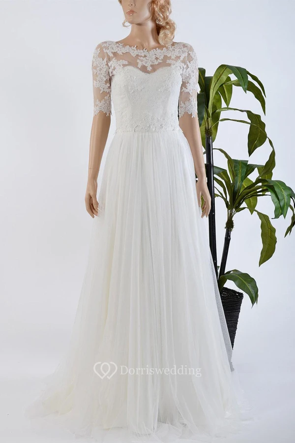 Tulle Satin Bowed Lace Bolero Modest Wedding Dress