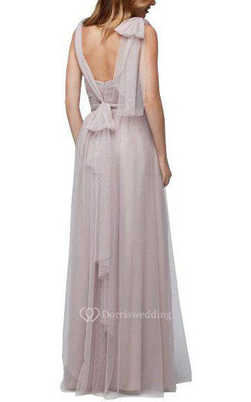 Tulle V-neck Long Bridesmaid Dress with Bow and Drapping