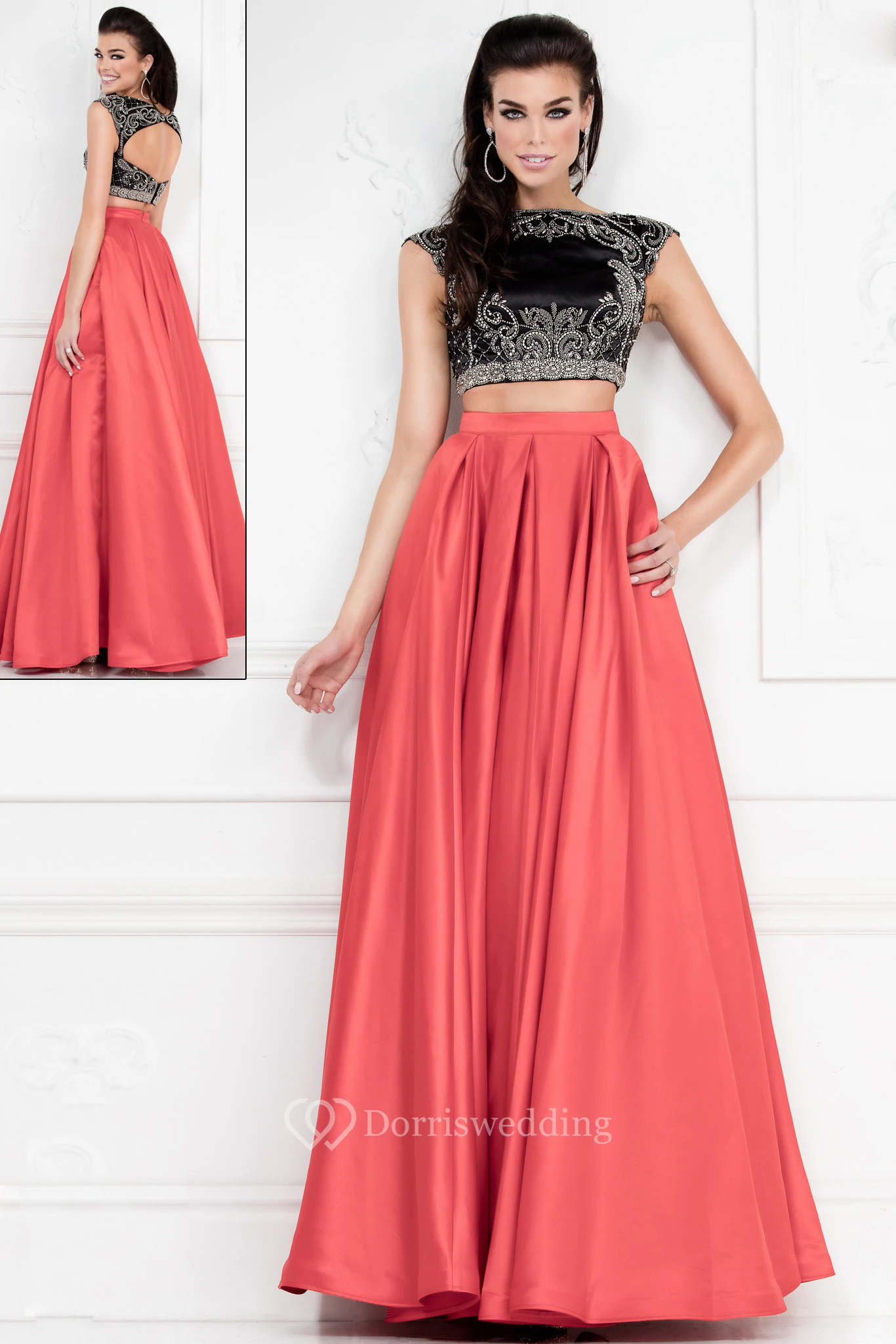 Two-Piece A-Line Floor-Length Jewel-Neck Sleeveless Satin Keyhole Dress With Beading