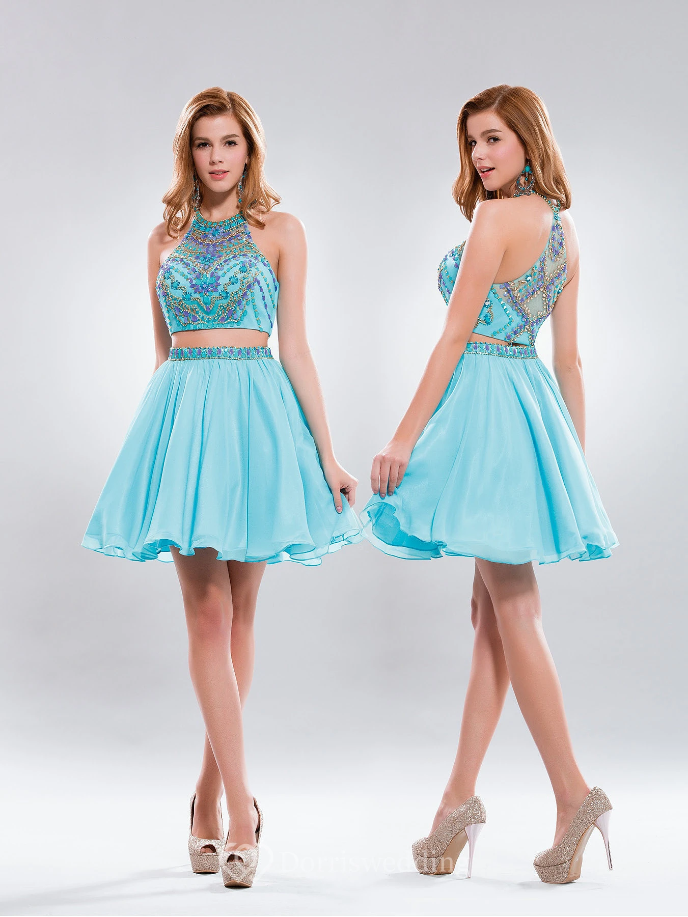 Two-Piece A-Line Short High Neck Sleeveless Chiffon Illusion Dress With Beading And Pleats