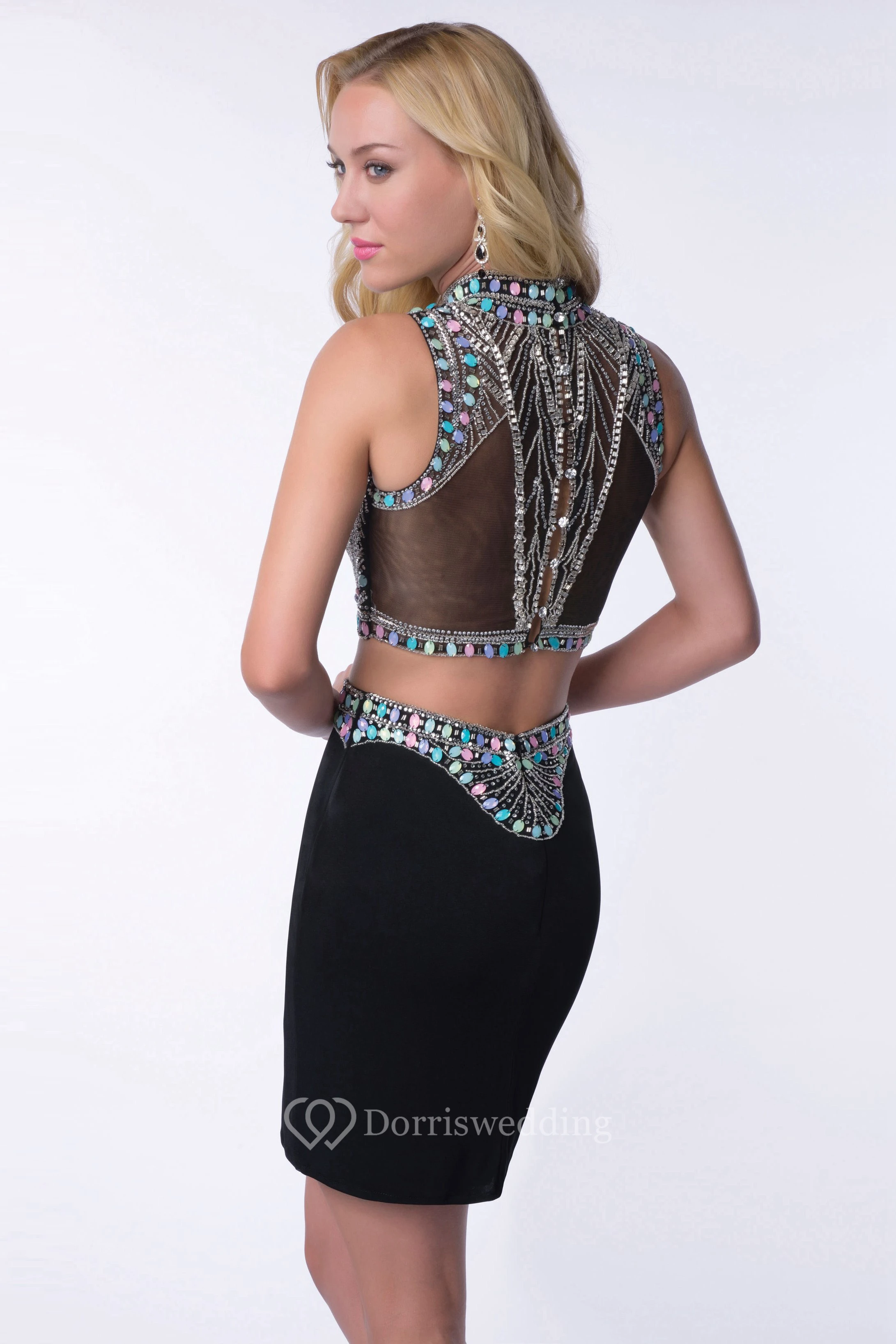 Two-Piece High Neck Sleeveless Homecoming Dress Embellished By Rhinestones