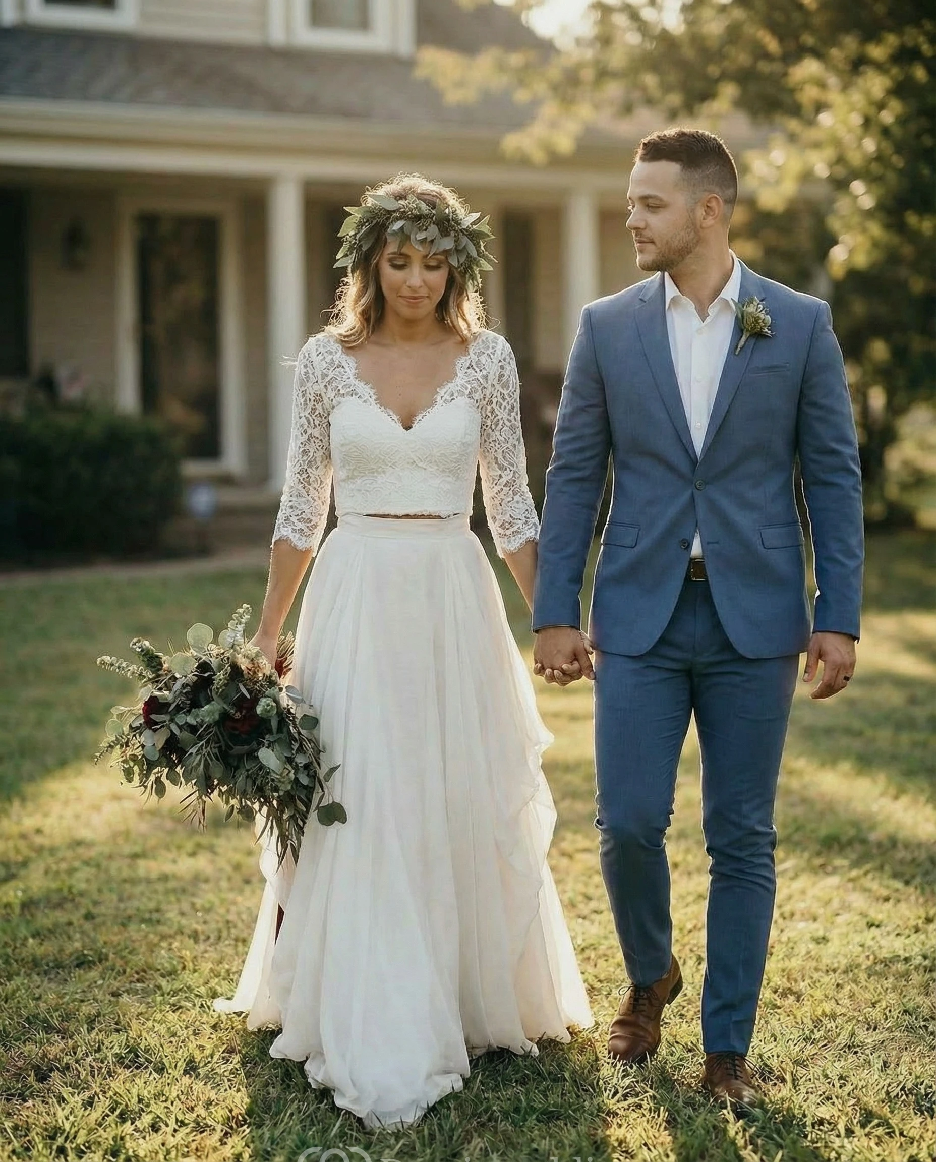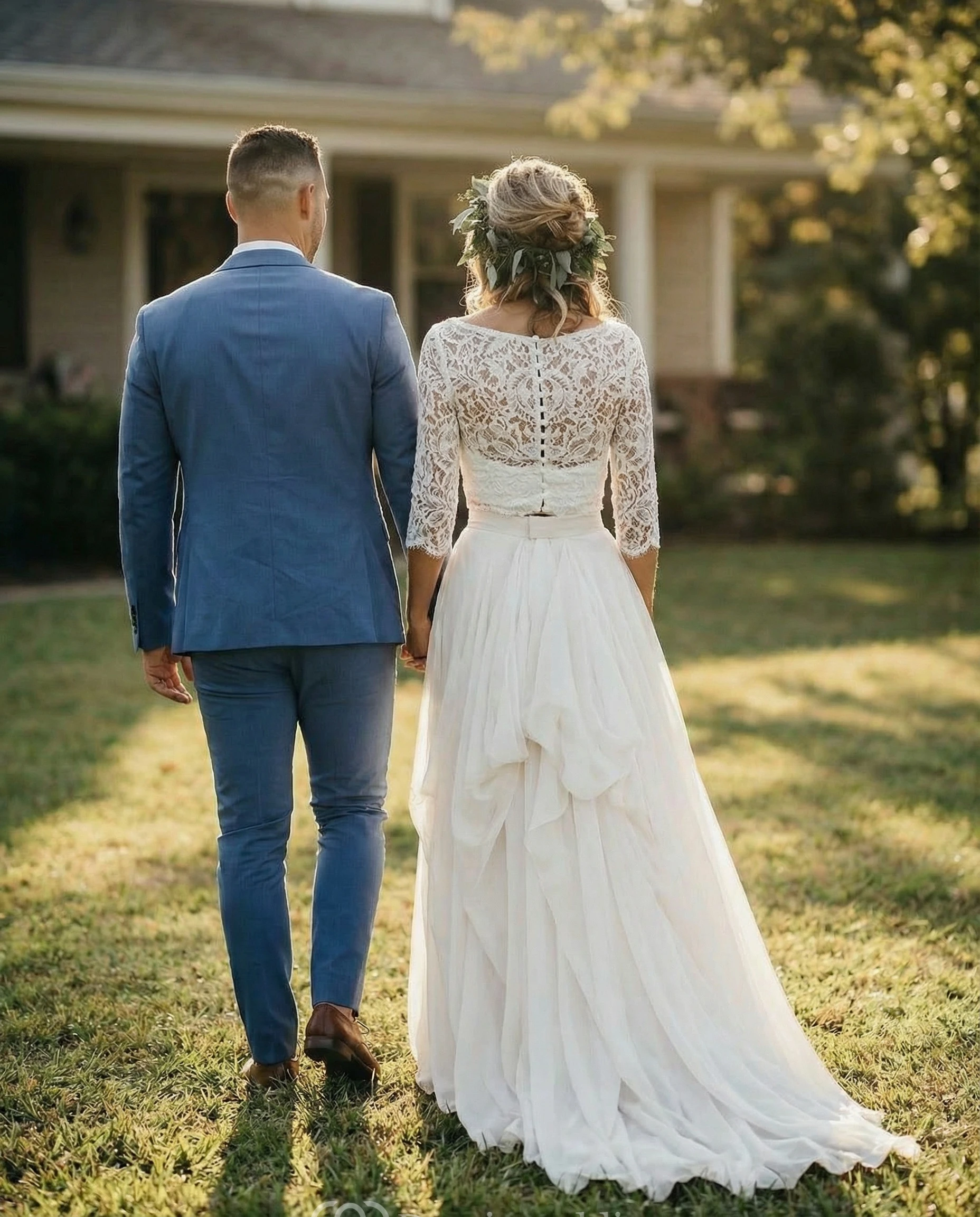 Two-Piece Lace Wedding Gown with 3/4 Sleeves