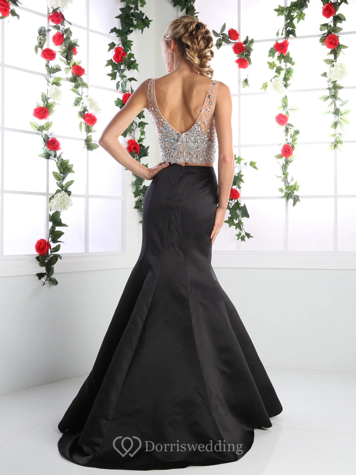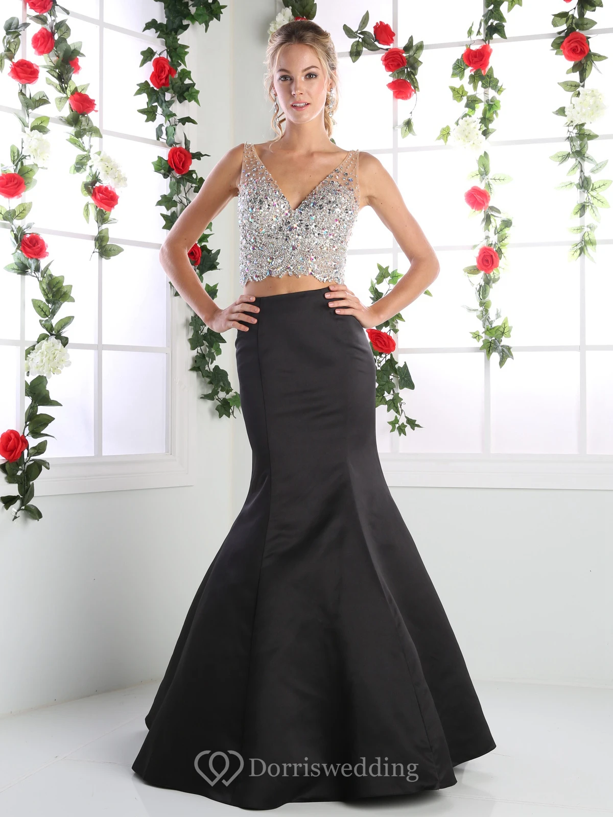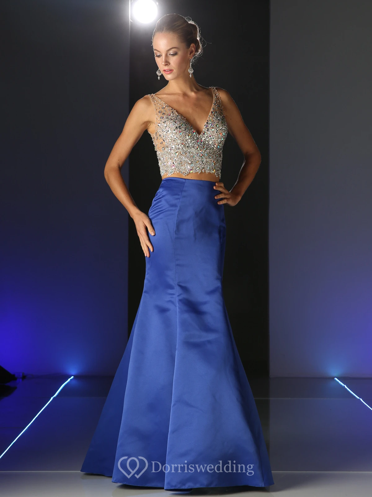 Two-Piece Mermaid Floor-Length V-Neck Sleeveless Satin Low-V Back Dress With Beading