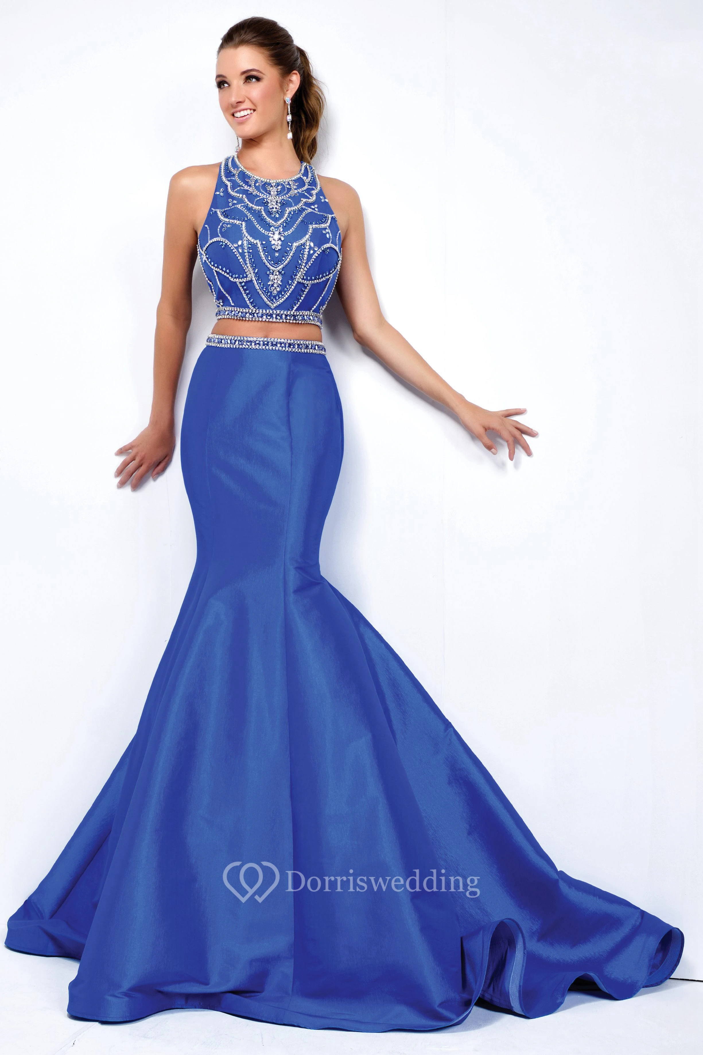 Two-Piece Mermaid Long Jewel-Neck Sleeveless Satin Court Train Dress With Beading