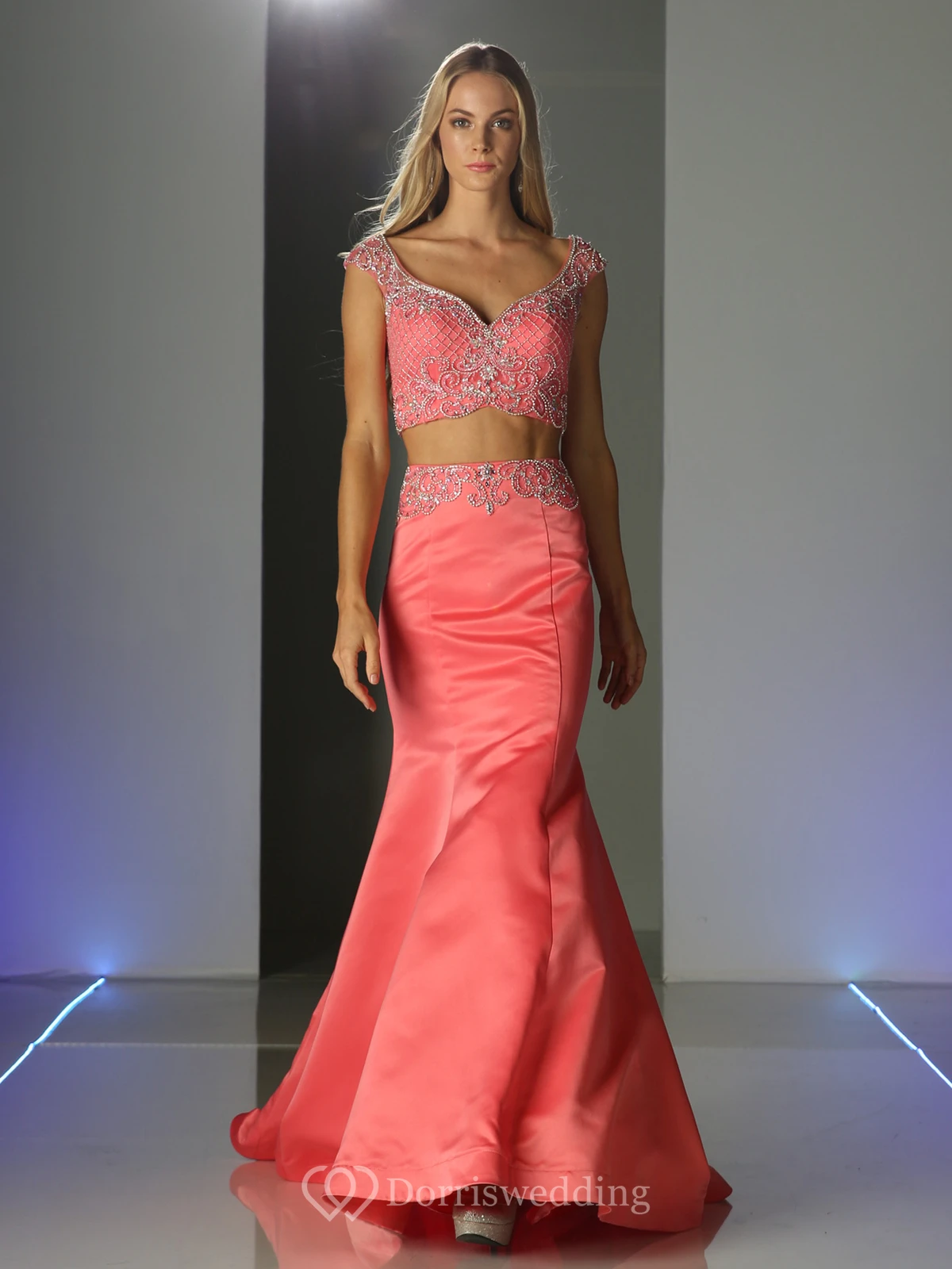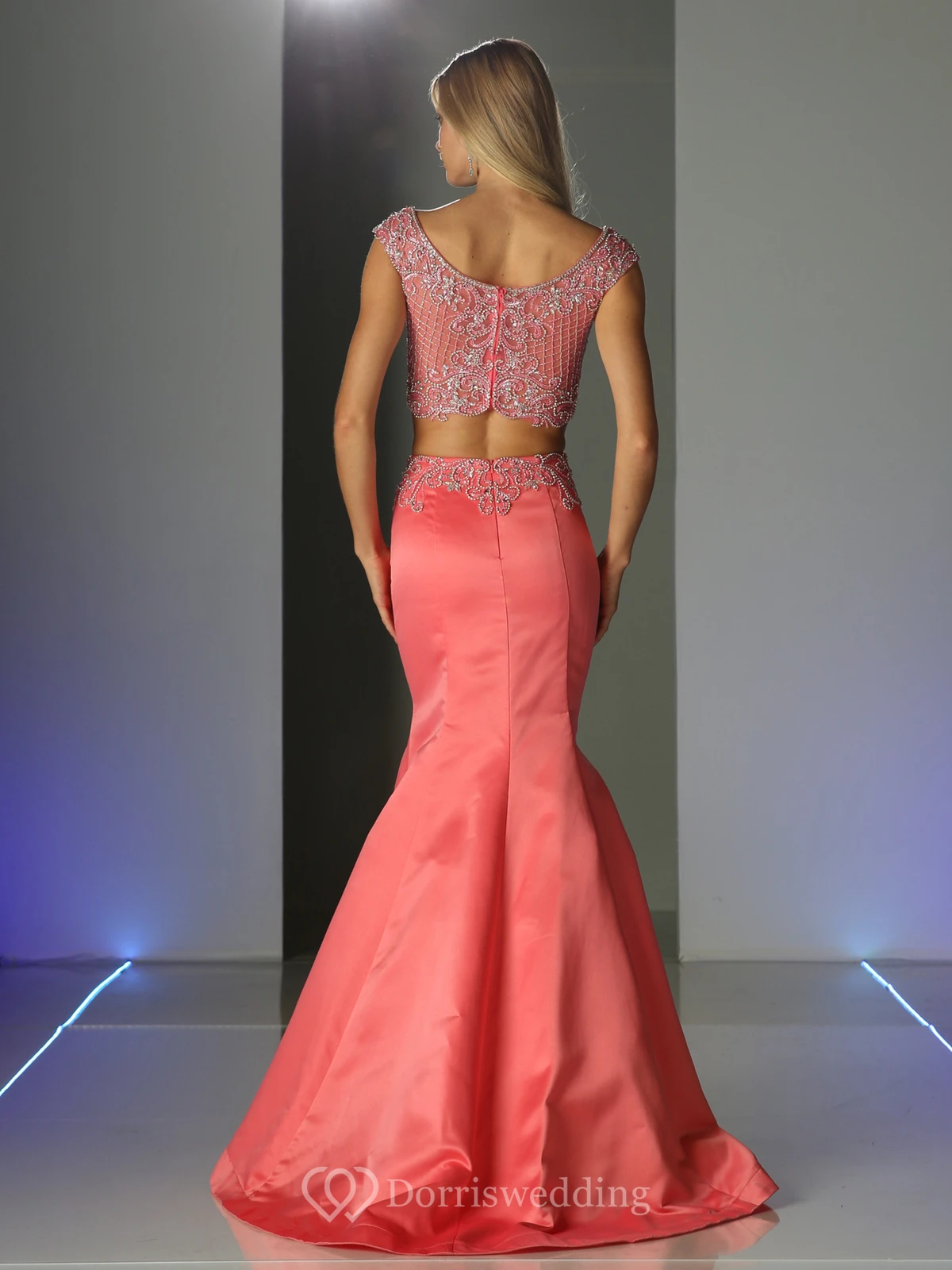 Two-Piece Mermaid Long V-Neck Cap-Sleeve Satin Sweep Train Zipper Dress With Beading