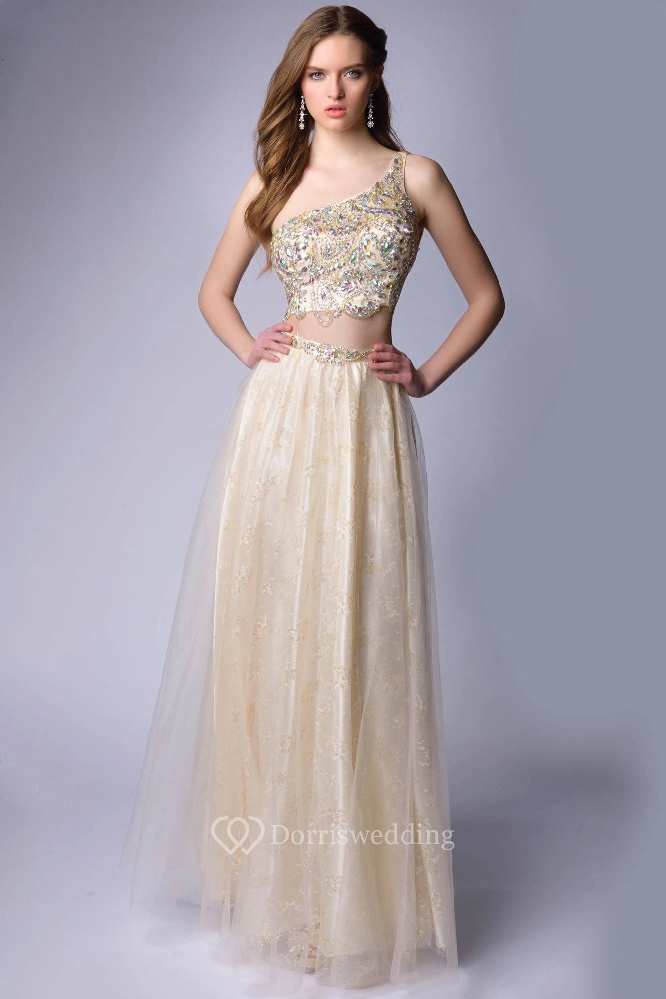 Two-Piece One-Shoulder A-Line Tulle Homecoming Dress With Corset Rhinestones