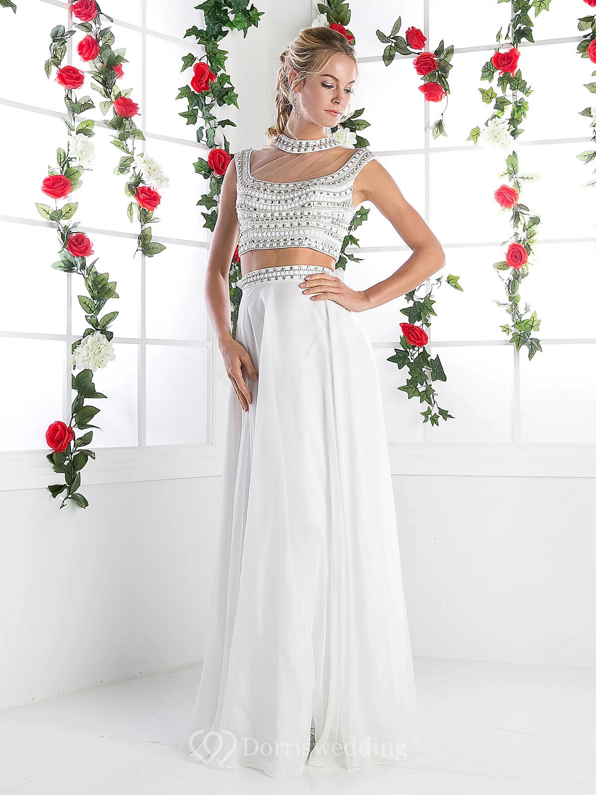 Two-Piece Sheath Long High Neck Sleeveless Chiffon Illusion Dress With Beading