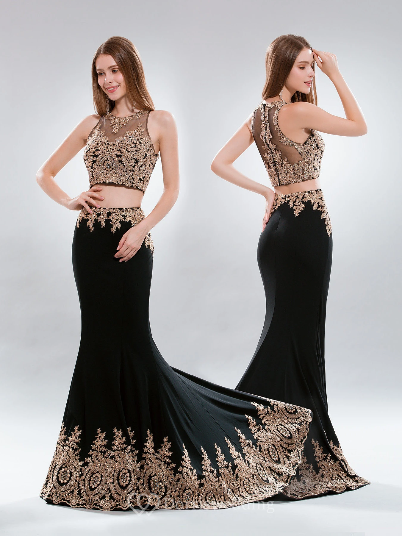 Two-Piece Sheath Long Jewel-Neck Sleeveless Jersey Illusion Dress With Appliques