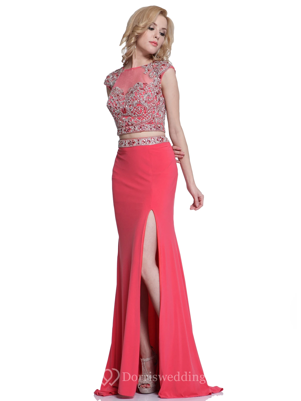 Two-Piece Sheath Long Scoop-Neck Cap-Sleeve Jersey Keyhole Dress With Split Front And Beading