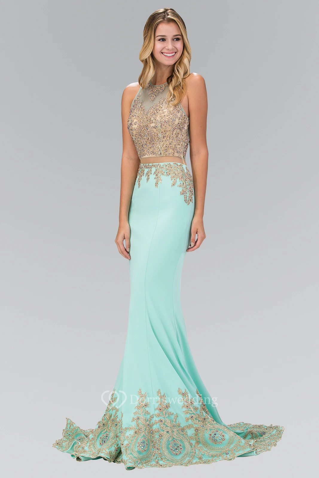 Two-Piece Sheath Long Scoop-Neck Sleeveless Jersey Illusion Dress With Beading And Appliques