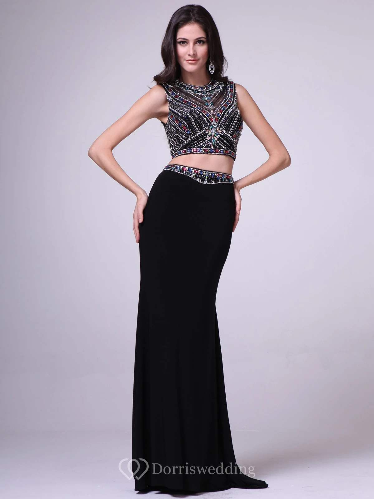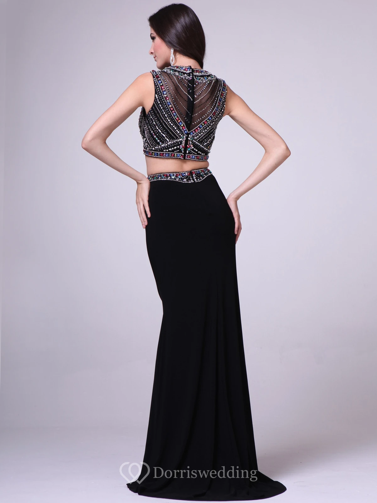 Two-Piece Sheath Maxi Jewel-Neck Sleeveless Jersey Illusion Dress With Crystal Detailing
