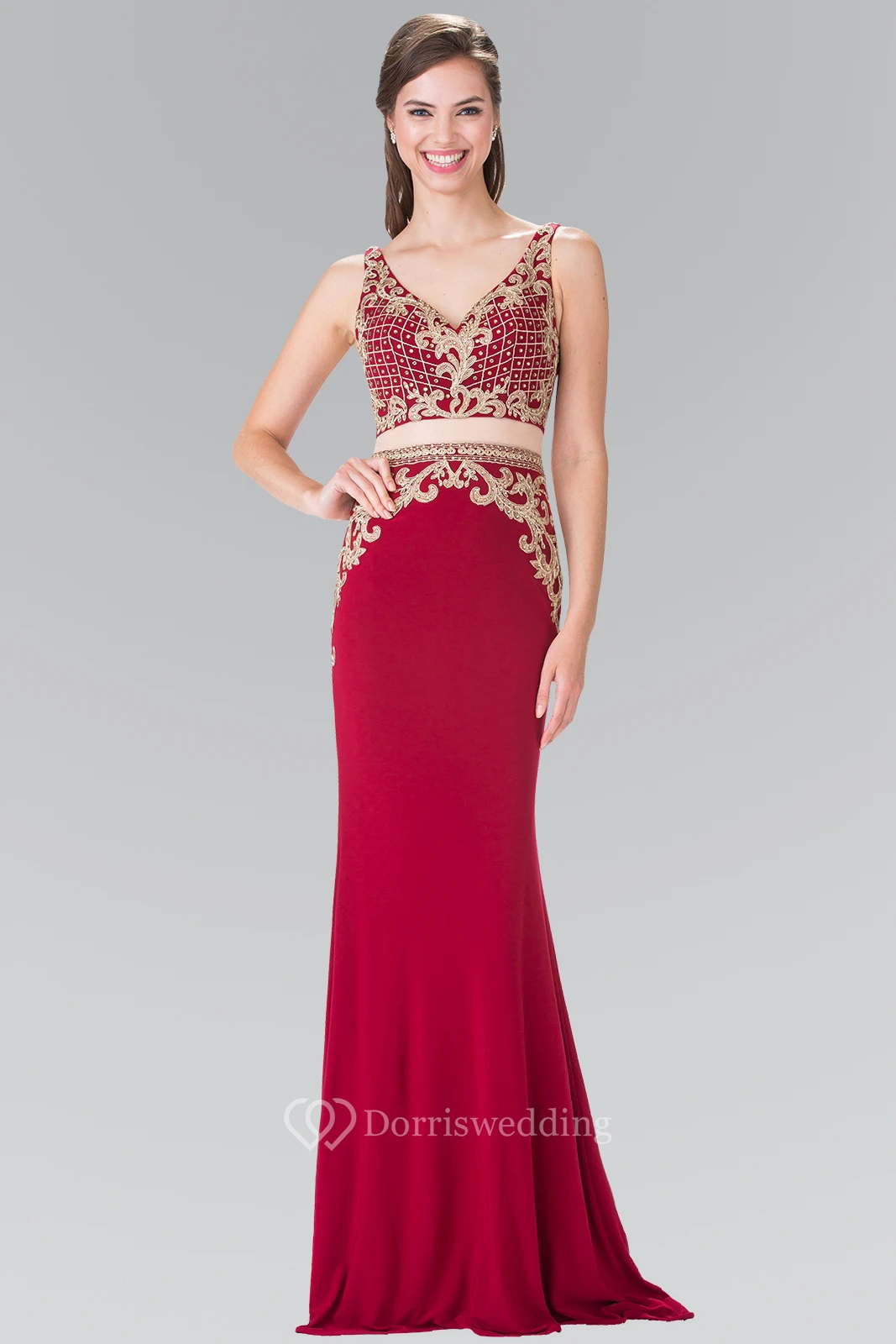 Two-Piece Sheath V-Neck Sleeveless Jersey Dress With Appliques And Beading
