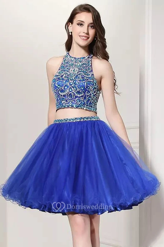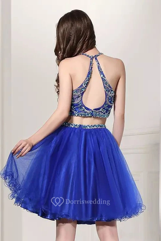 Two Piece Sleeveless Lace Halter Keyhole Short Mini Homecoming Dress