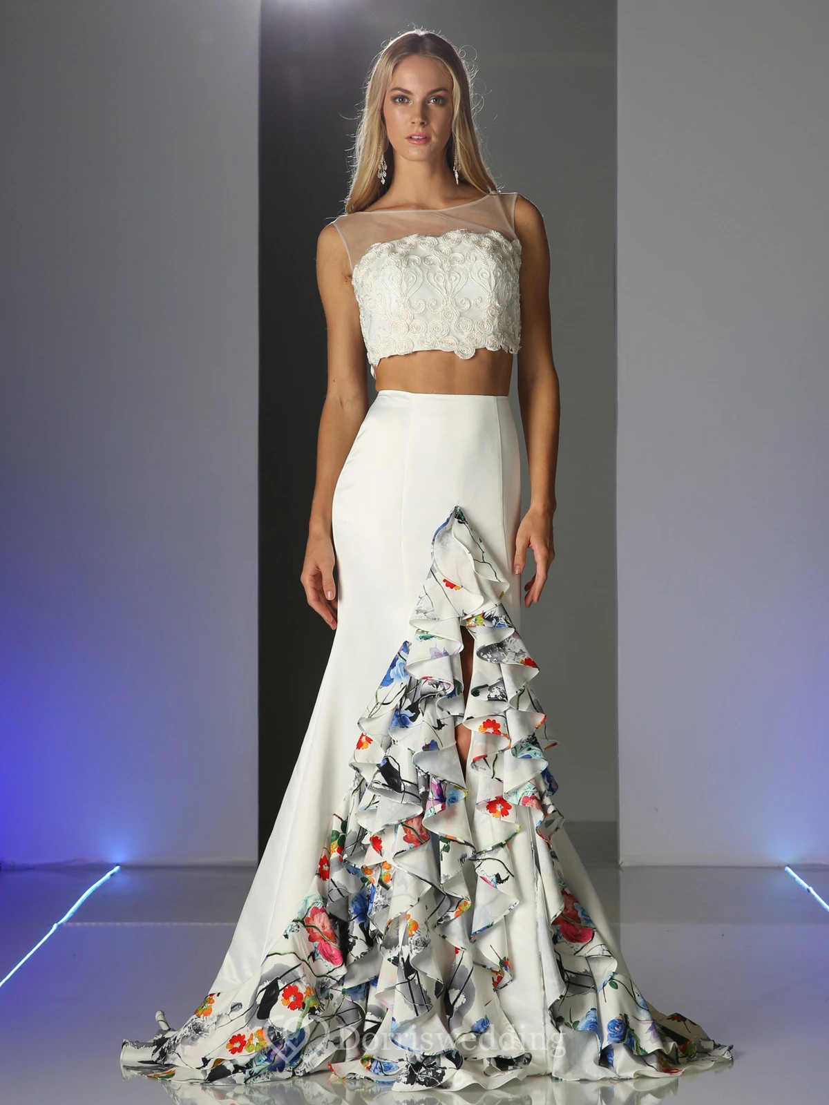 Two-Piece Trumpet Bateau Sleeveless Satin Illusion Dress With Appliques And Cascading Ruffles