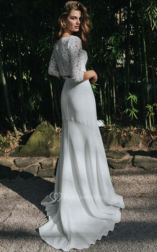 Two Piece V-neck Half-sleeve Front Split Wedding Dress with Lace Top