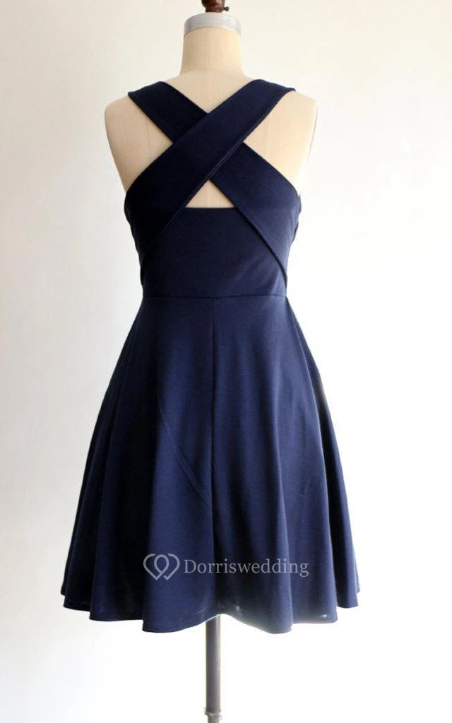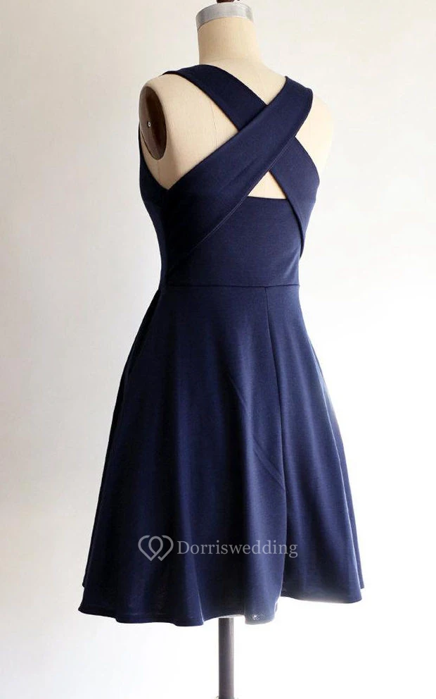 U Neck Sleeveless A-line Pleated Knee Length Jersey Dress Criss Cross Back
