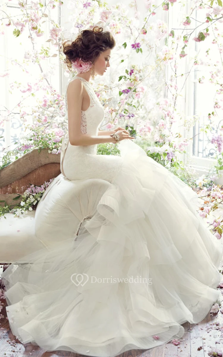 Unique Lace Jewel Neck Tiered Tulle Dress With Ribbon Belt