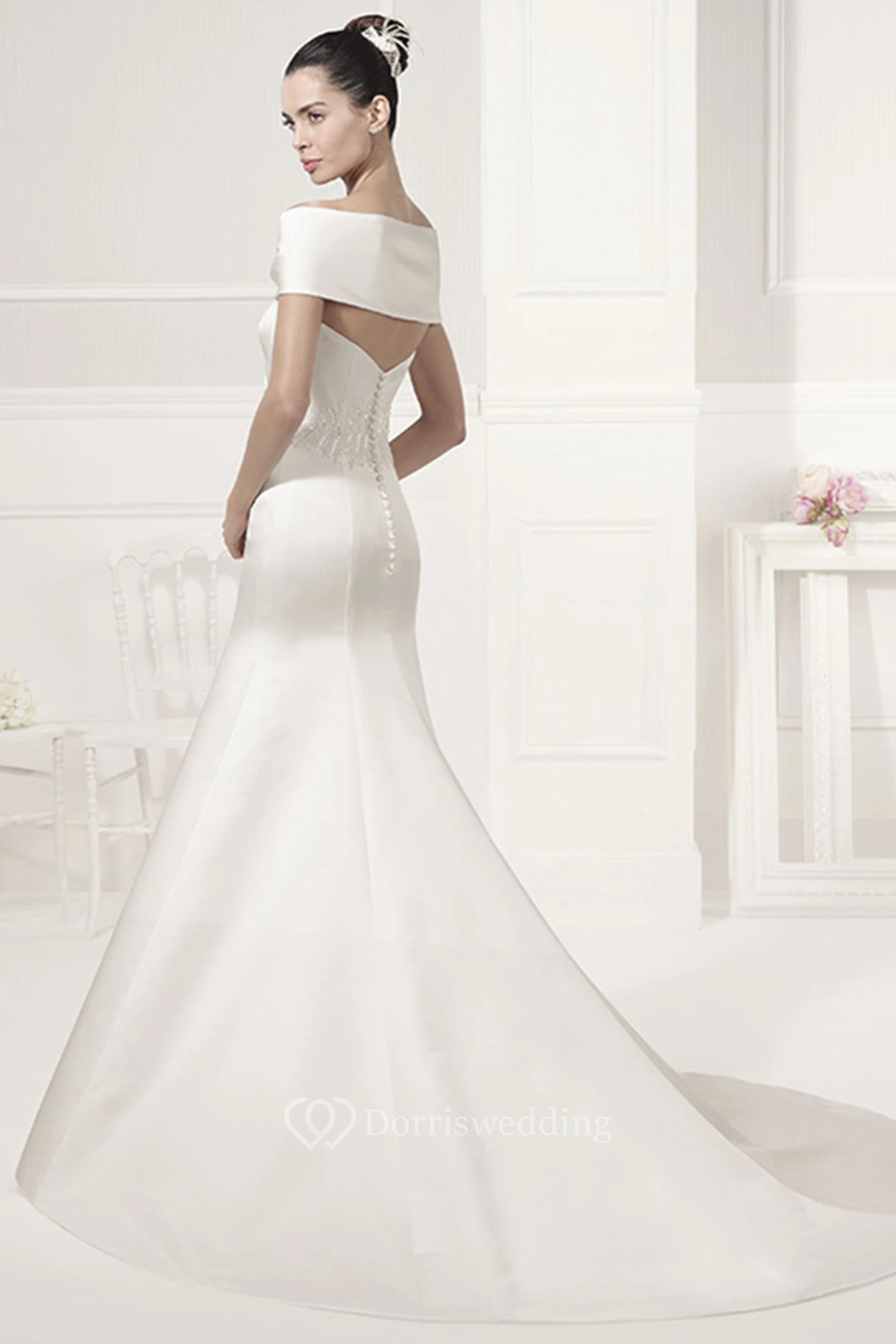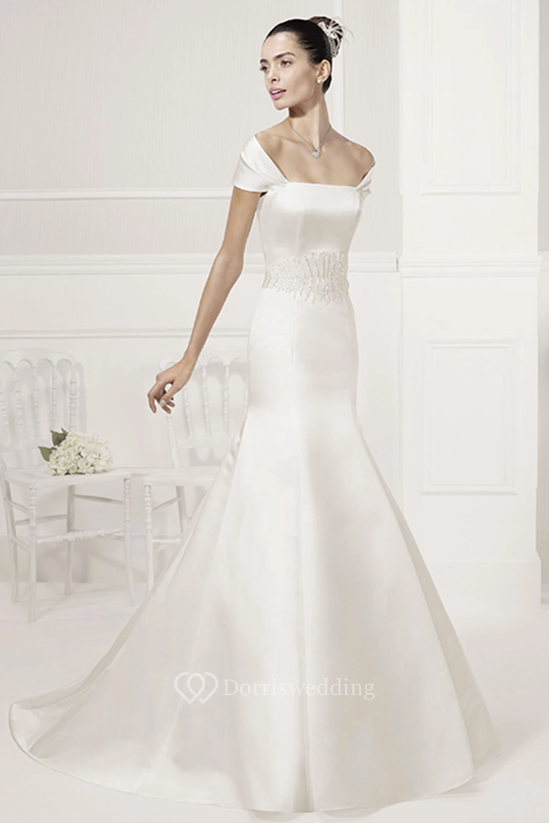 Unique Off-Shoulder Mermaid Satin Bridal Gown With Beading Waist