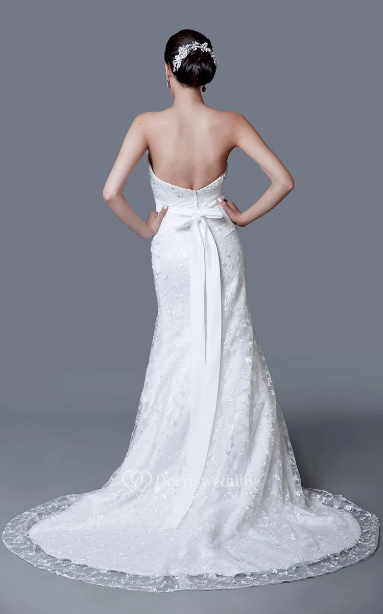 This exquisite mermaid wedding gown will definitely impress your guests on your special day. The strapless bodice has a sweetheart neckline and a ribbon at the natural waist. The trumpet skirt begins seamlessly below the hips, and falls to the floor with a brush train. The dress is covered in a delicate lace pattern, and has lovely beaded detail along the bodice.