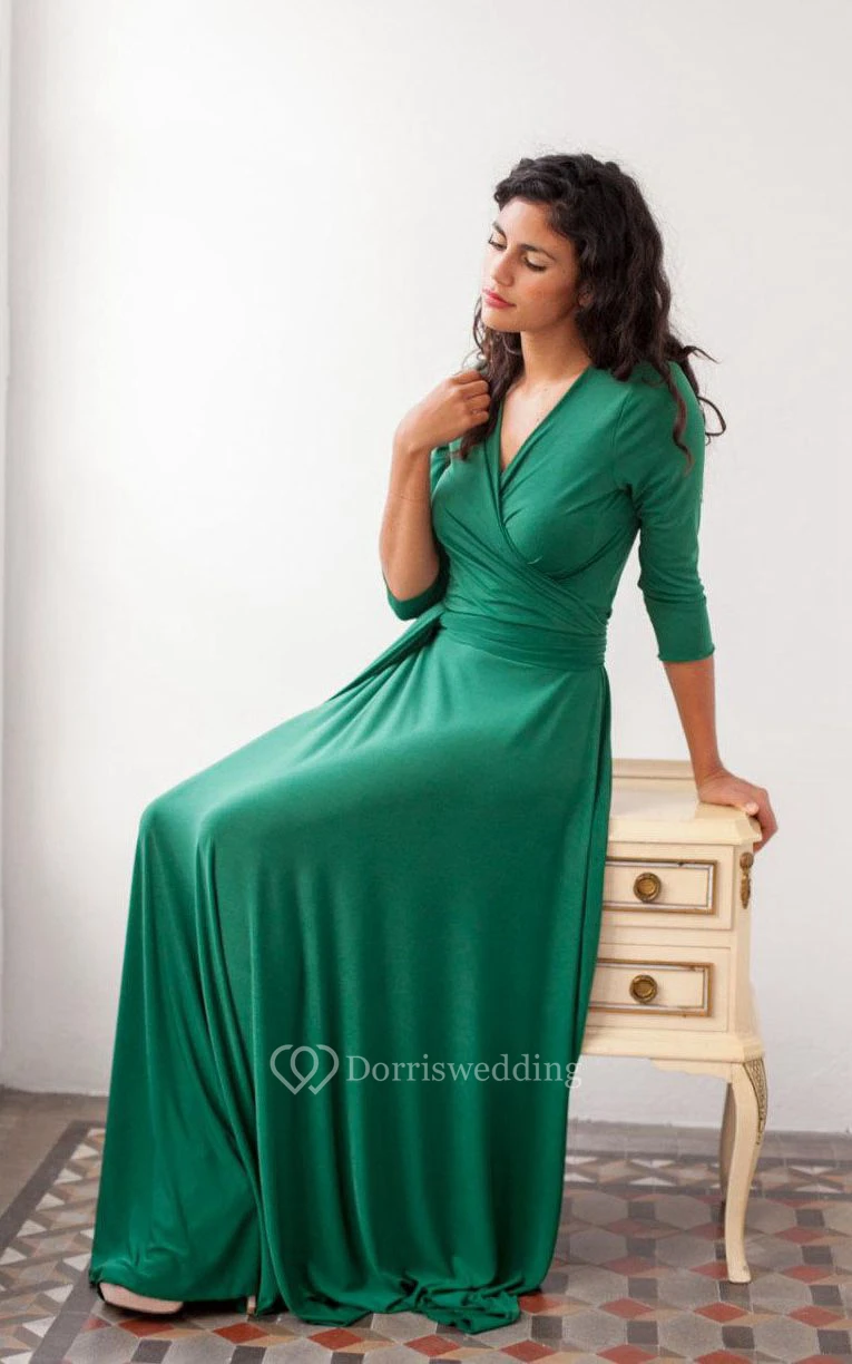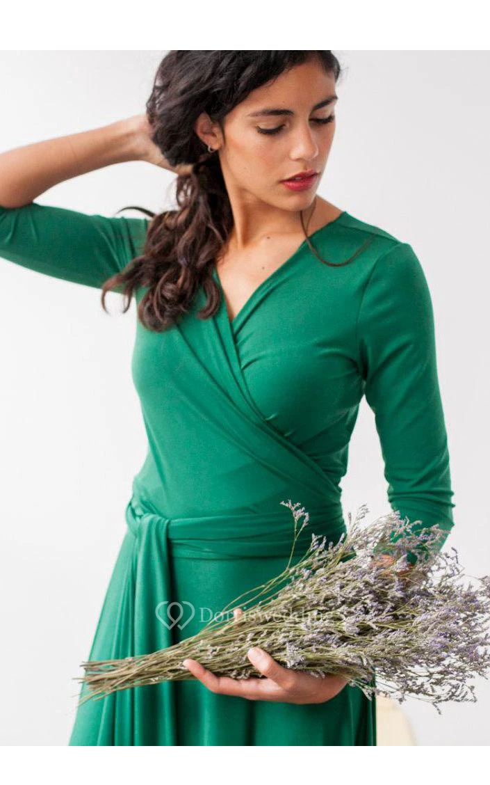 V Neck 3-4 Sleeve A-line Pleated Jersey Long Dress With Sash