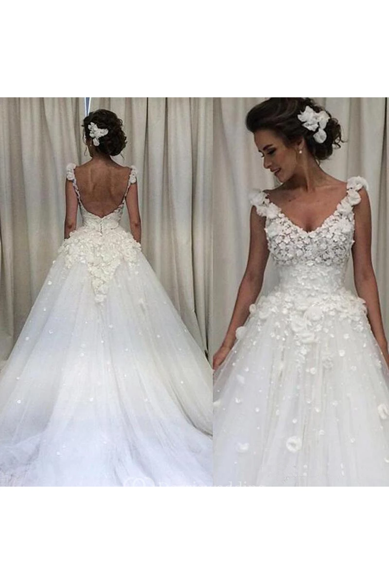 V Neck 3D Flower Applique Backless Sweep Train Spring Garden Bridal Gown