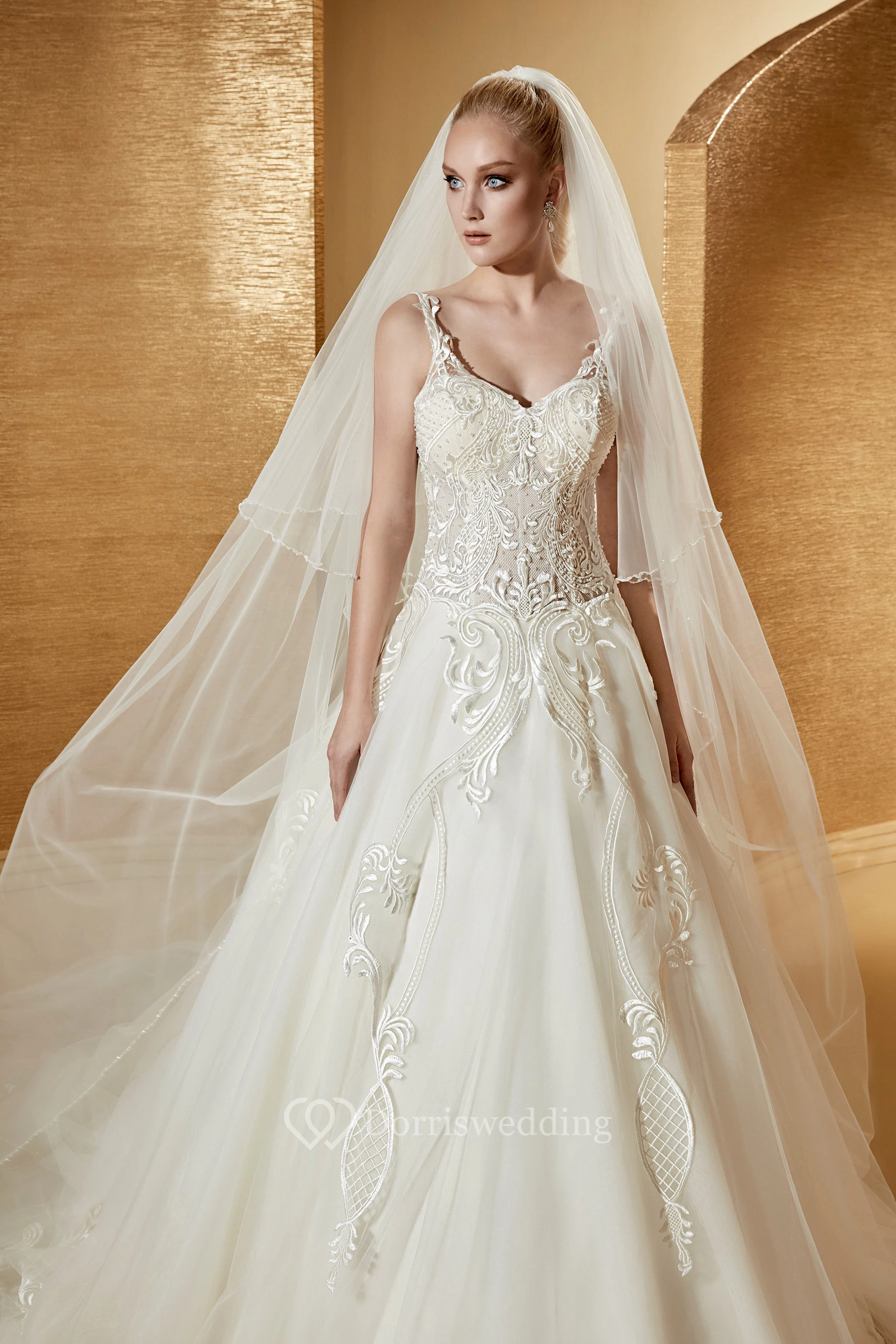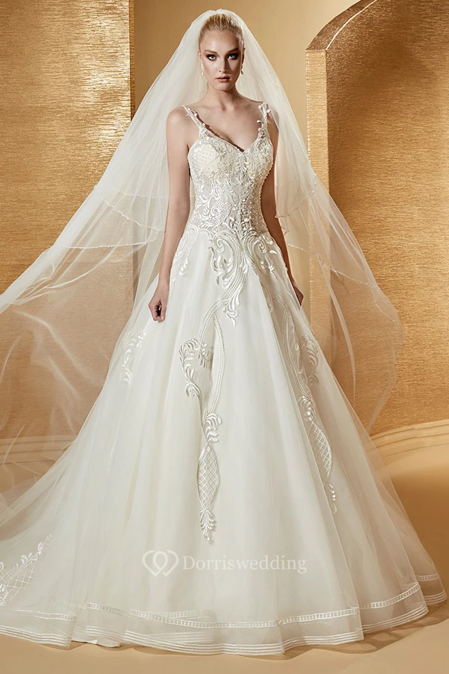 V-Neck A-Line Bridal Gown With Fine Appliques Details And Spaghetti Straps