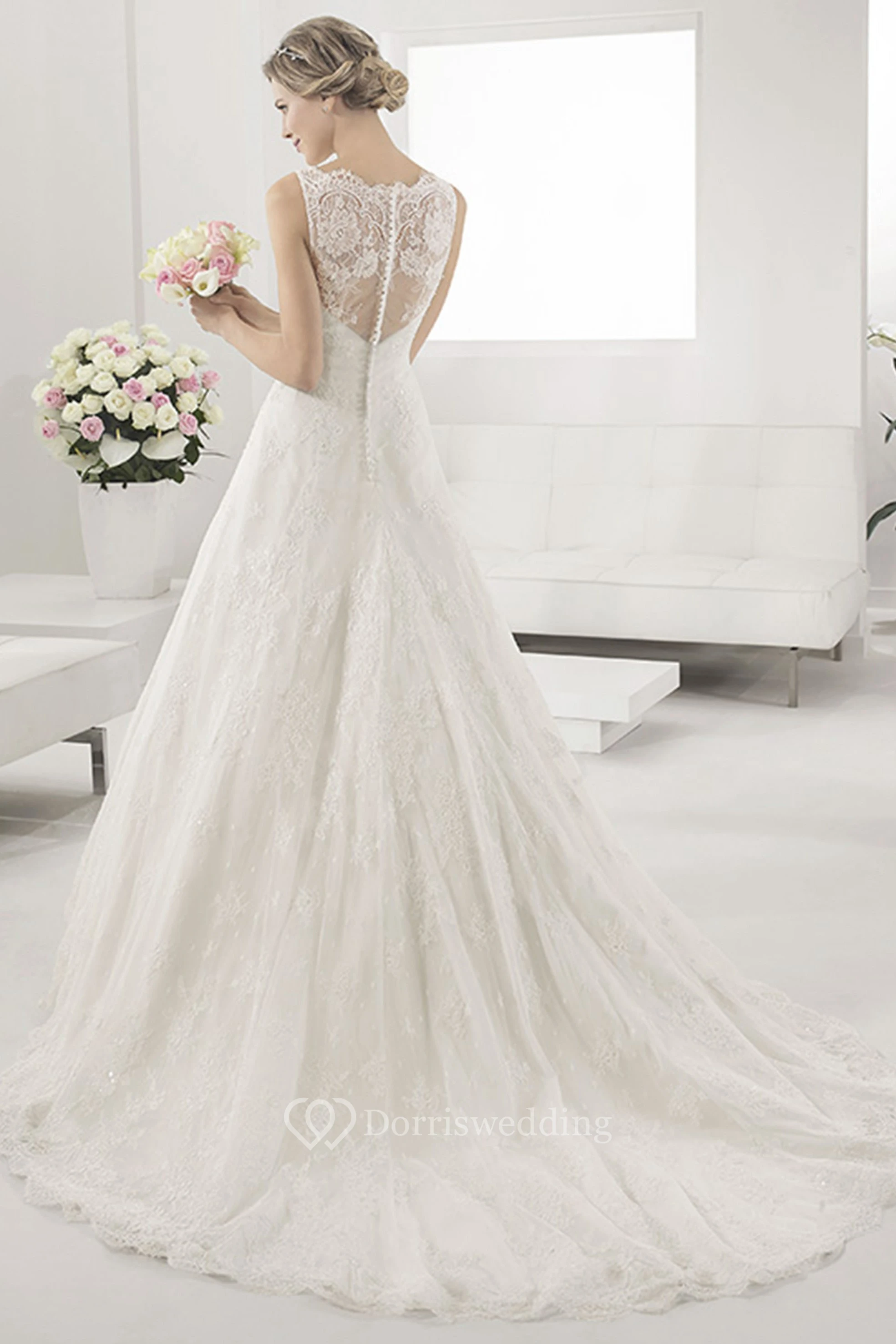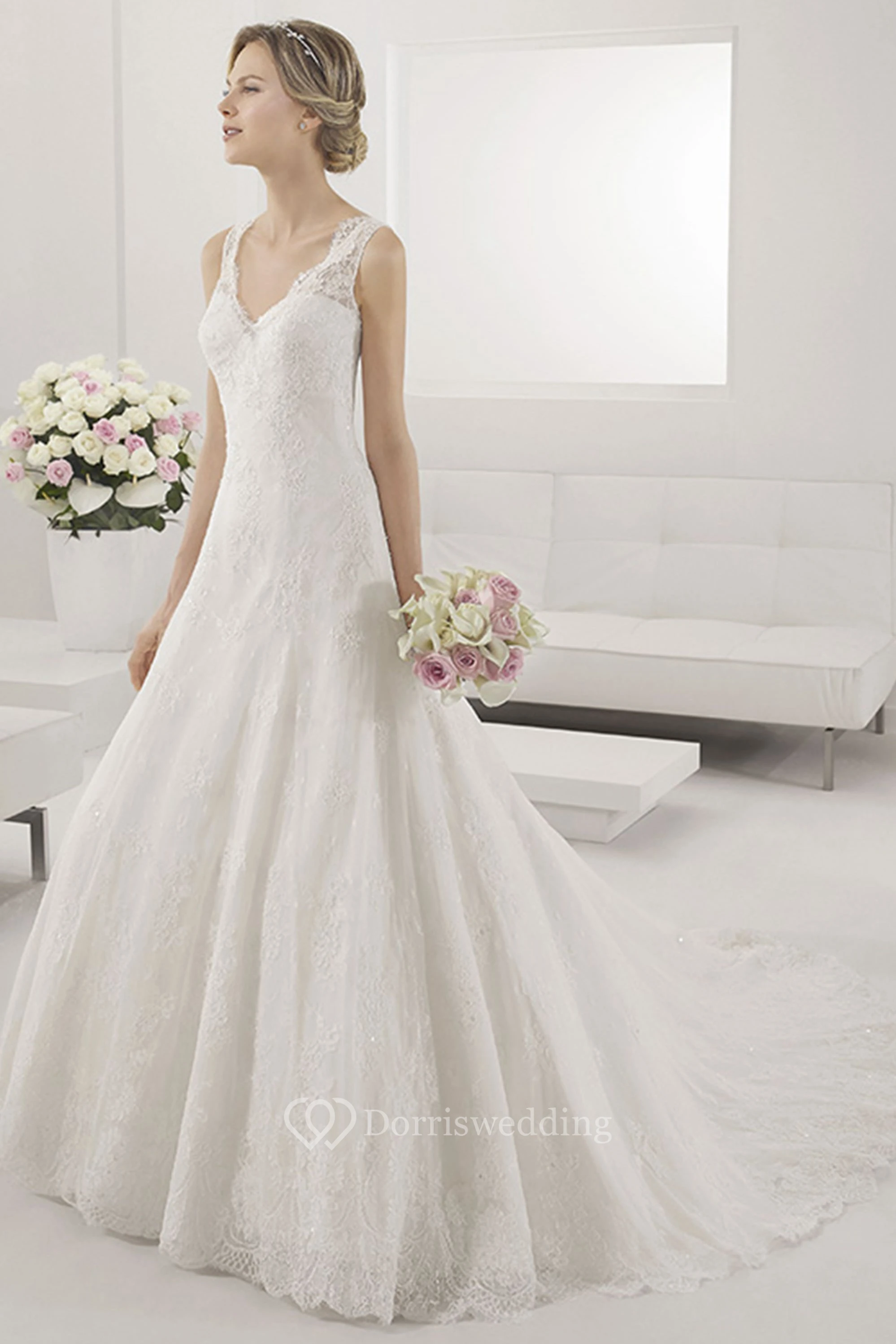 V Neck A-Line Lace Gown With Illusion Straps And Back