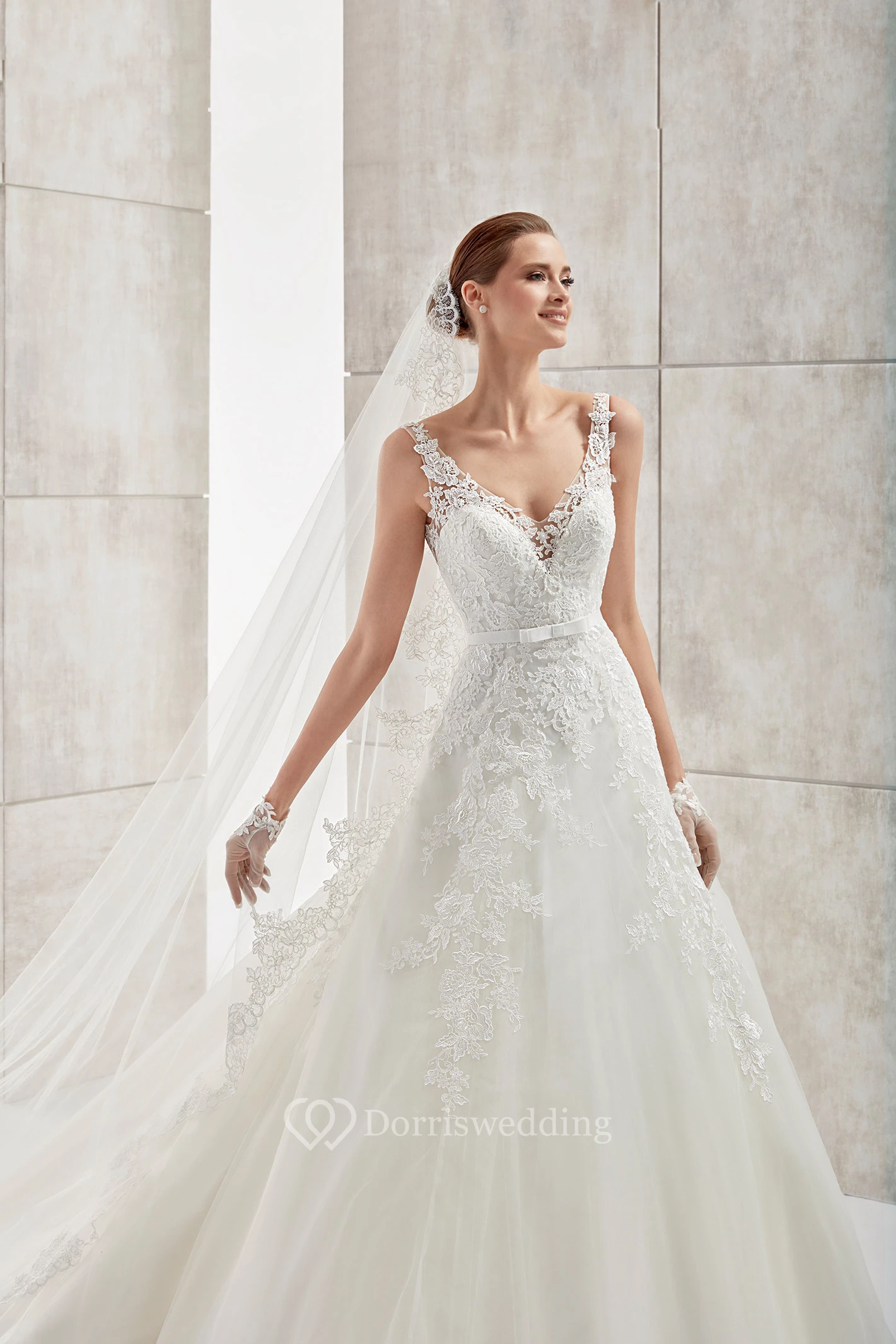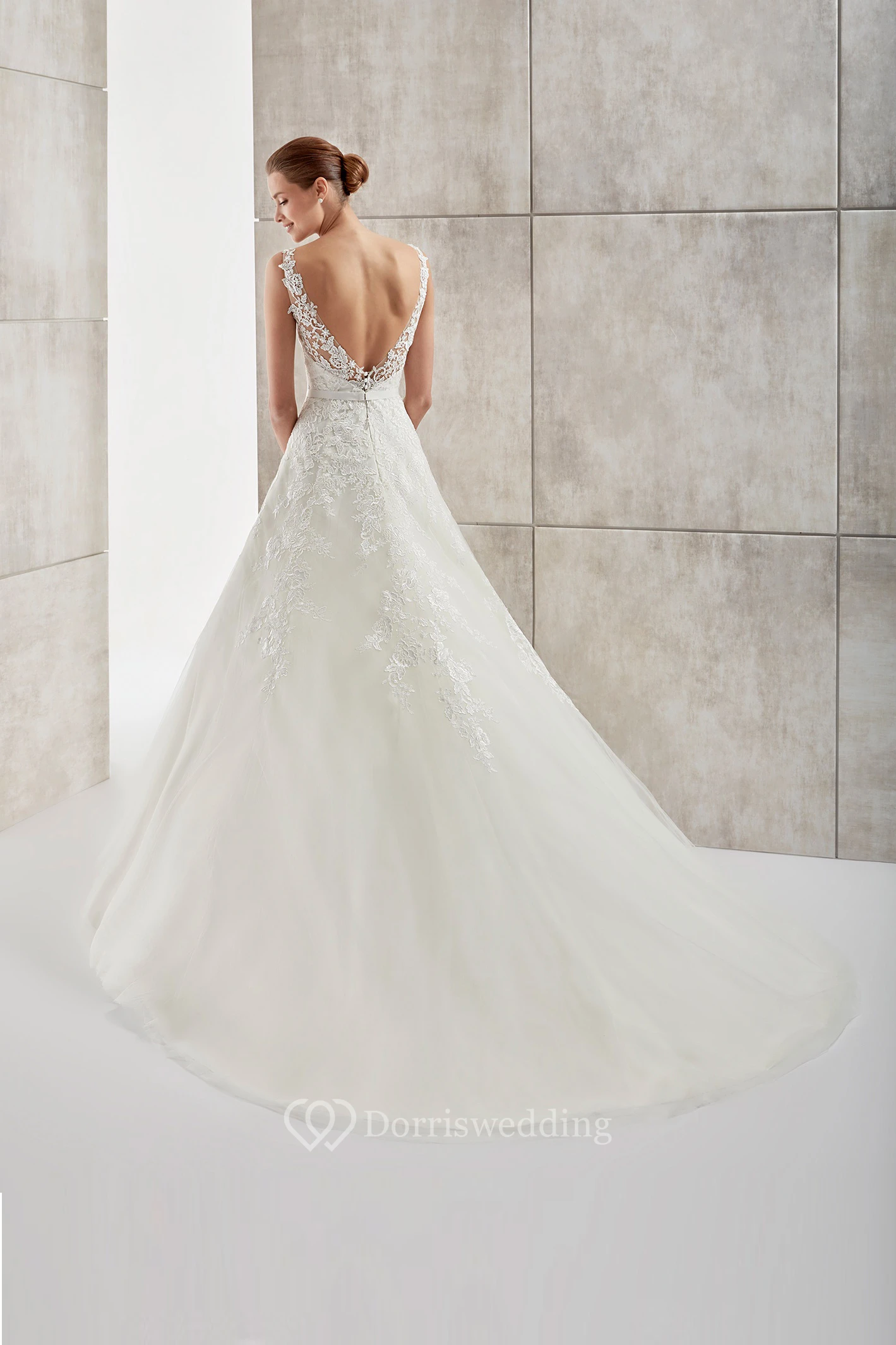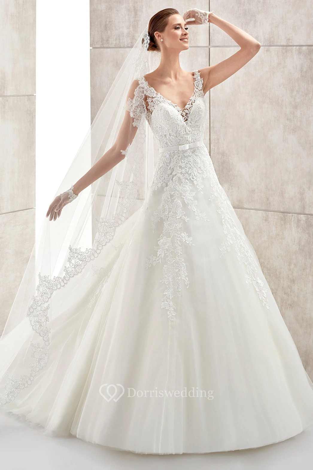V-Neck A-Line Long Wedding Dress With Lace Appliques And Open Back
