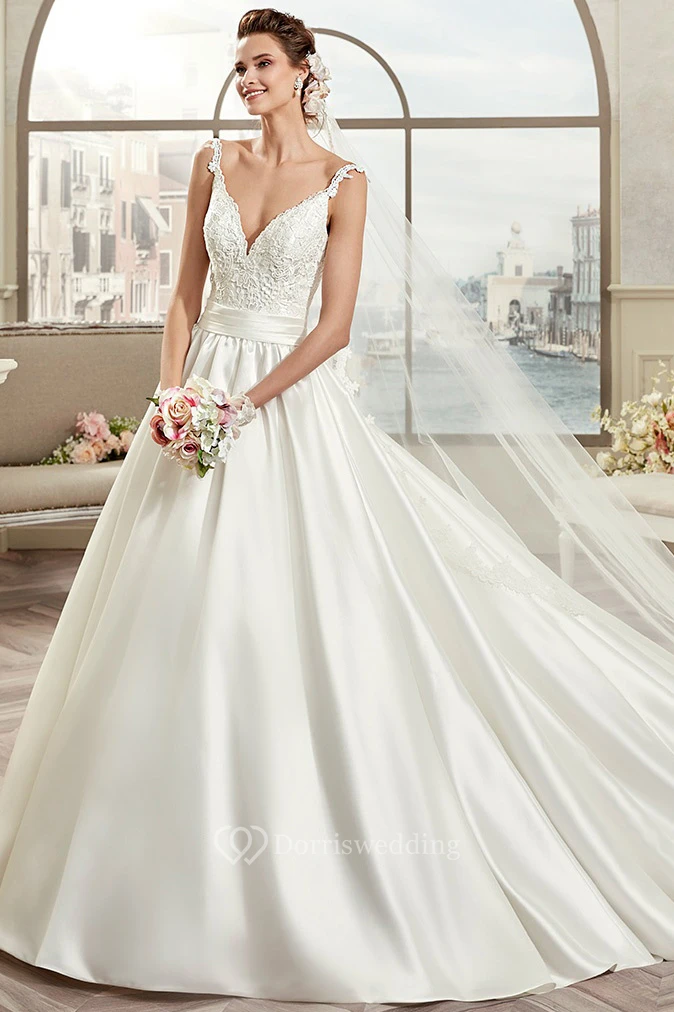 V-Neck A-Line Open-Back Bridal Gown With Cinched Waistband And Appliques Straps