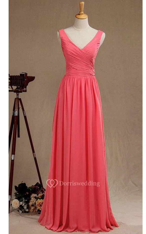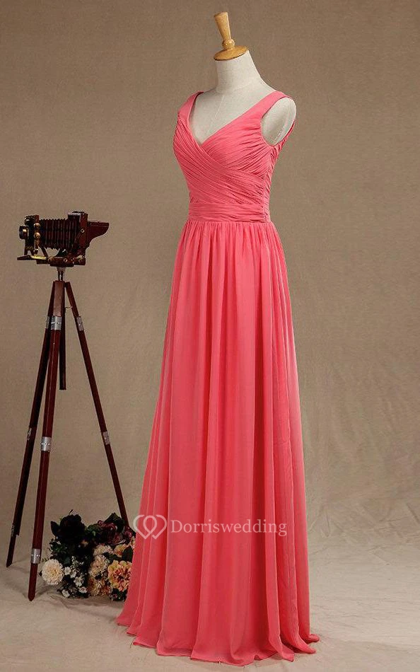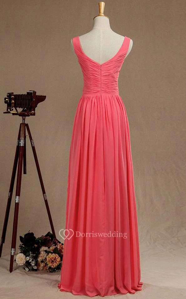 V Neck A-line Pleated Chiffon Floor Length Dress V Back