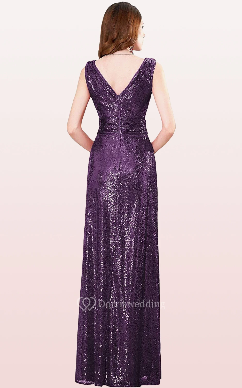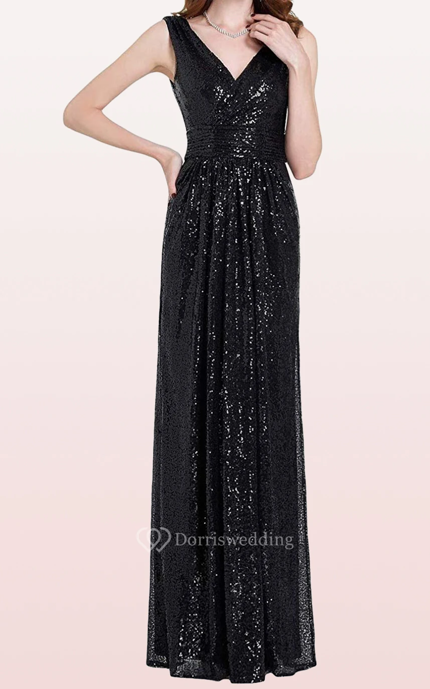 V-neck A Line Sleeveless Floor-length Sequins Bridesmaid Dress With Ruching
