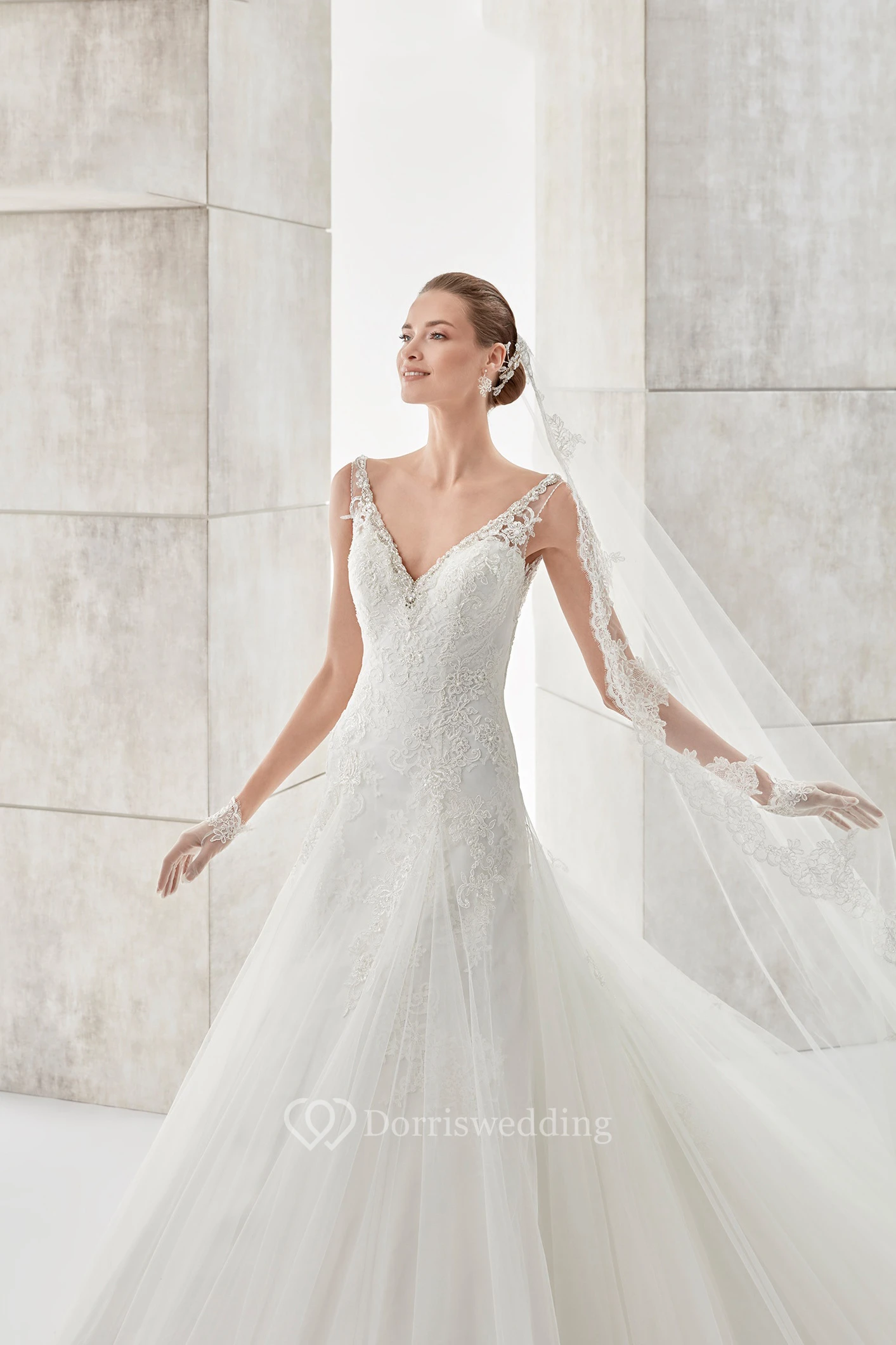 V-neck A-line Wedding Dress with Illusive Lace Straps and Low-V Back