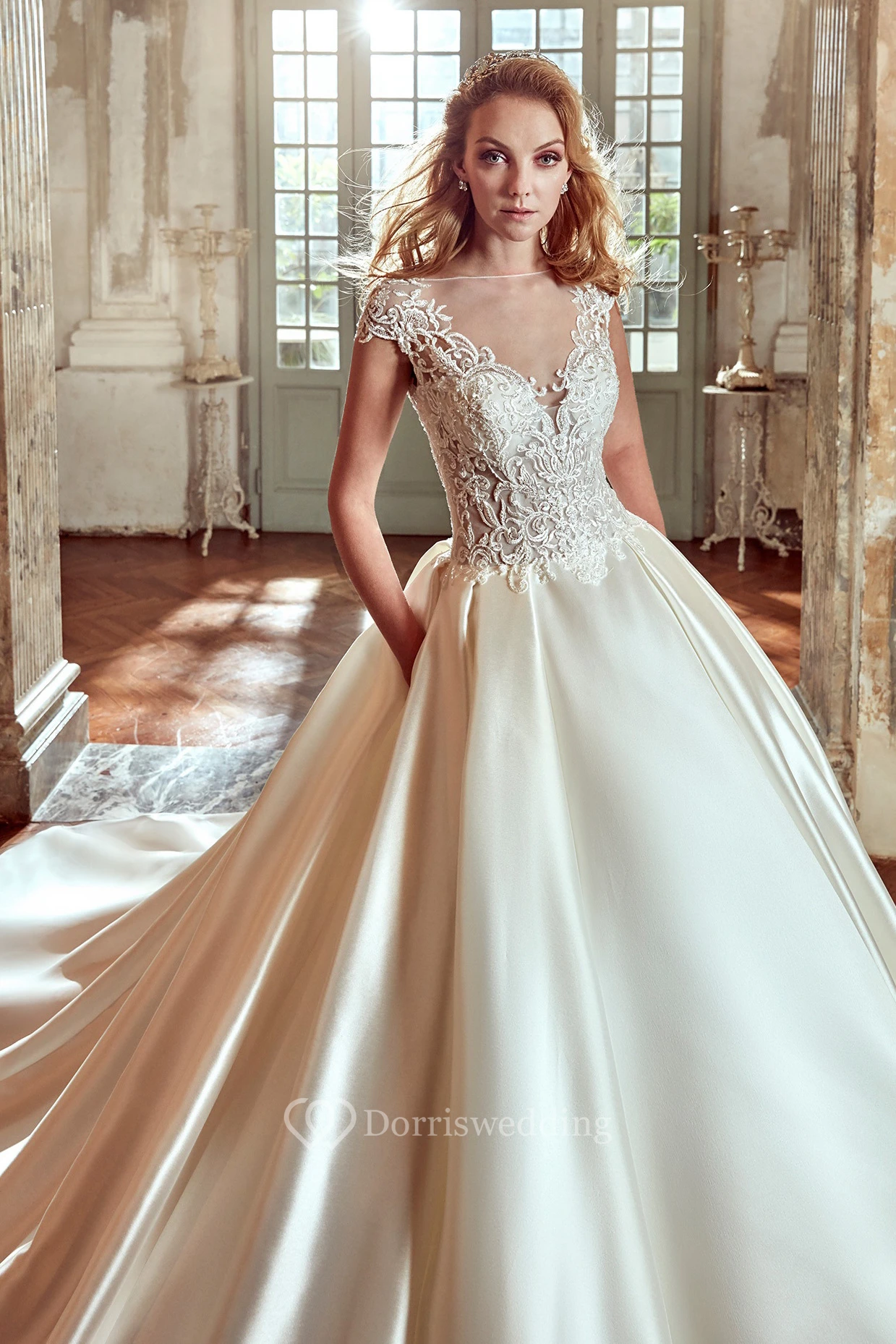 V-Neck A-line Wedding Dress With Lace Bodice and Satin Skirt