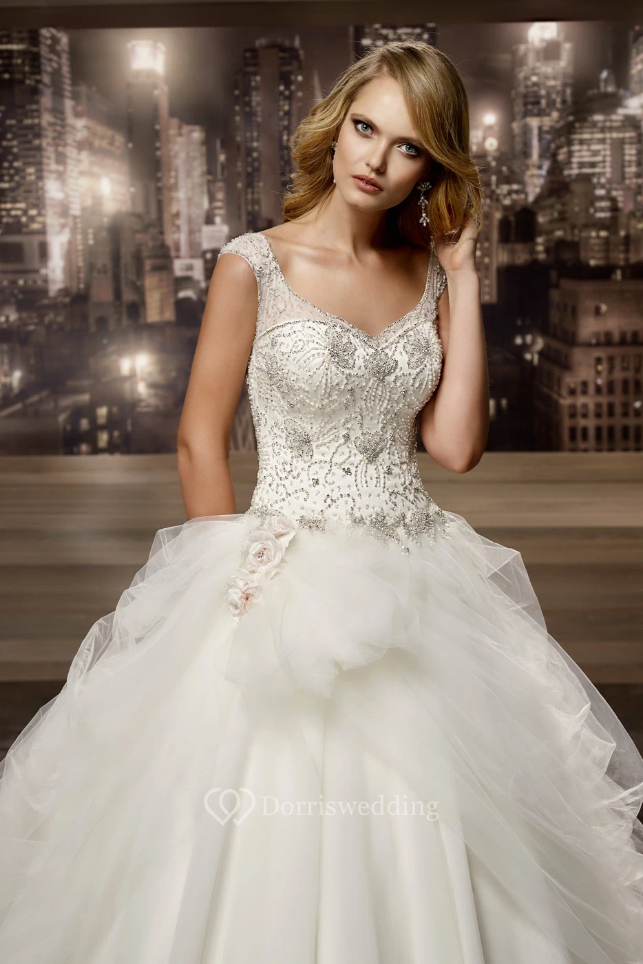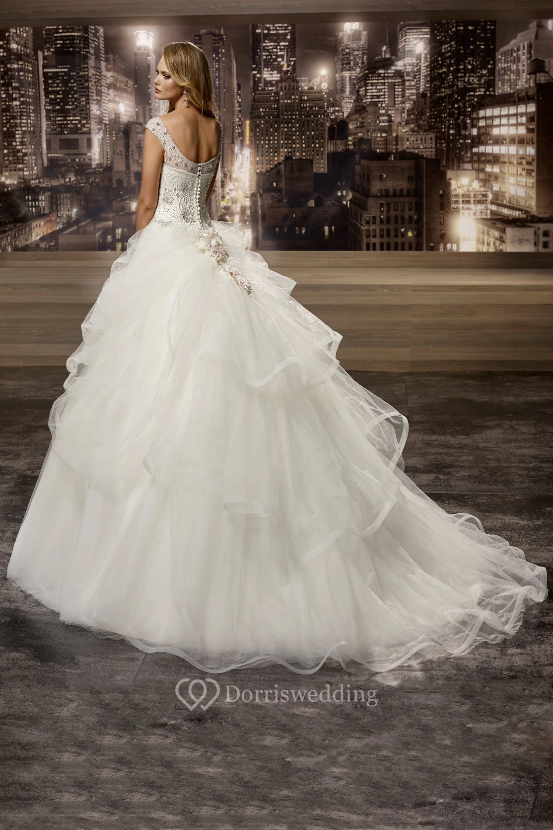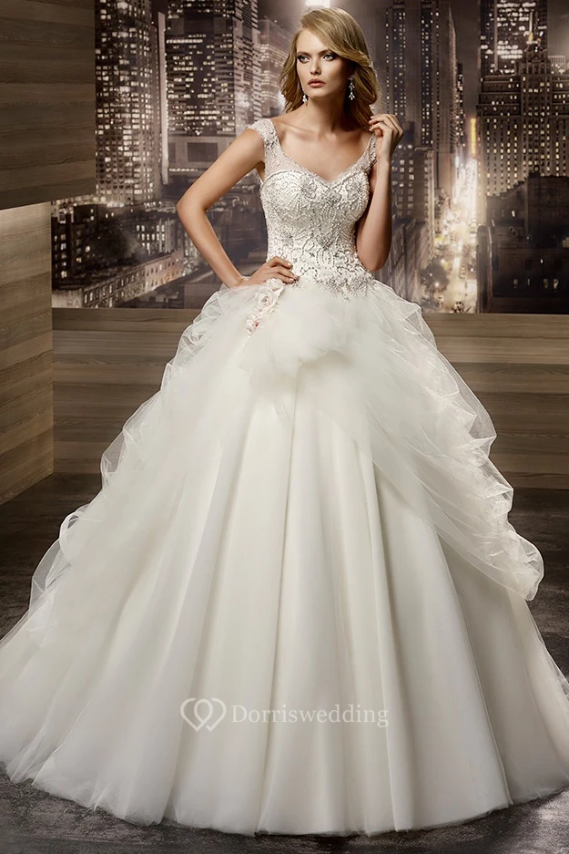 V-neck A-line Wedding Gown with Beaded Corset and Asymmetrical Ruffles Overlayer