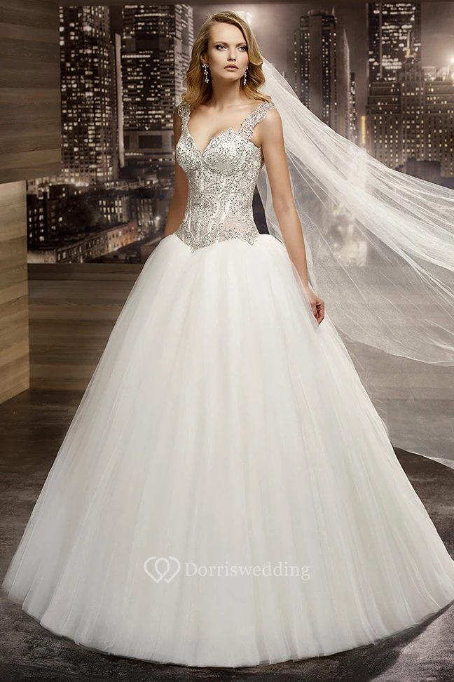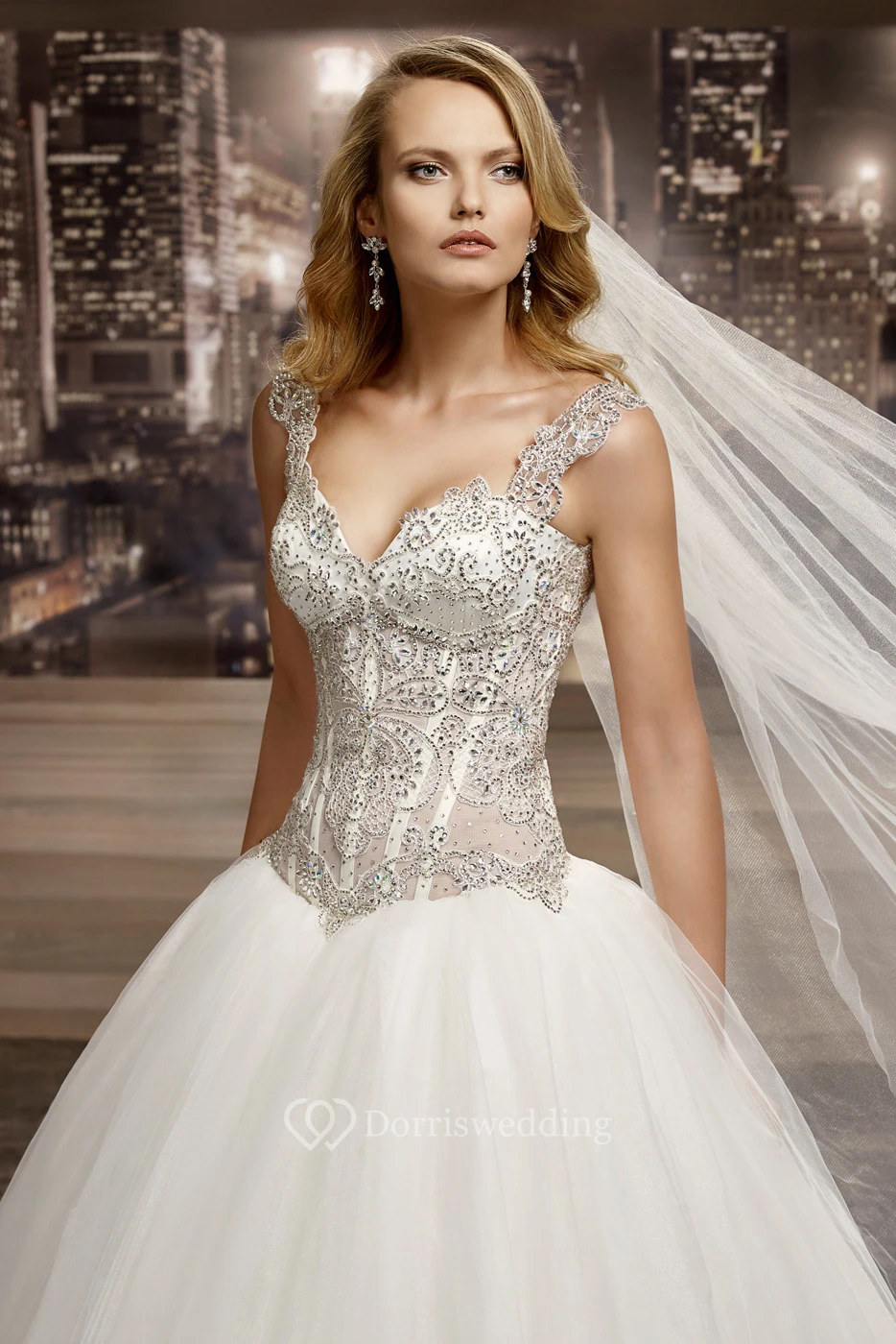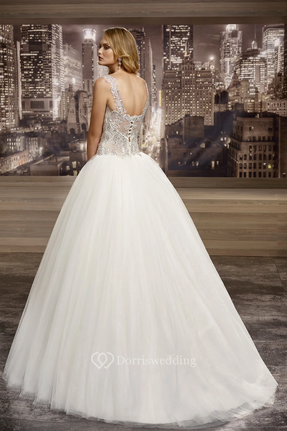 V-neck A-line Wedding Gown with Beaded Corset and Half Open Back