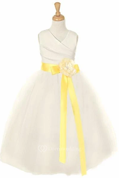 V-Neck Ankle-Length Tiered Tulle&Satin Flower Girl Dress