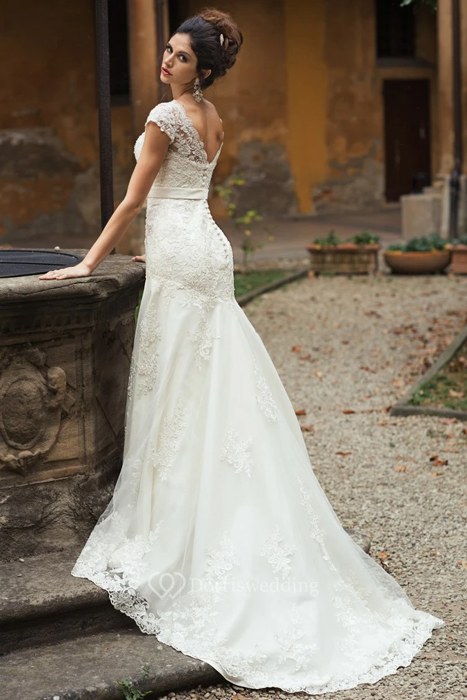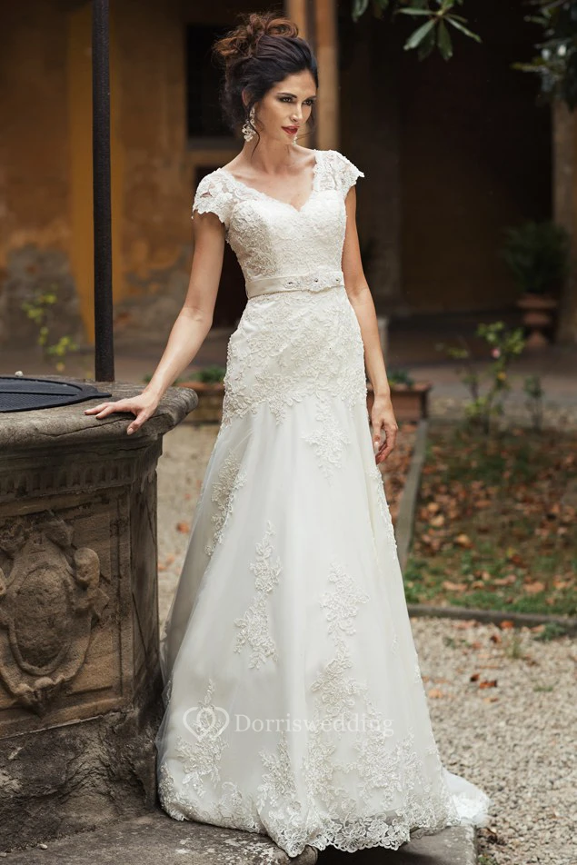 V-Neck Appliqued Maxi Cap-Sleeve Lace Wedding Dress With Sash