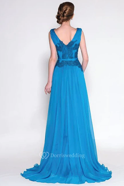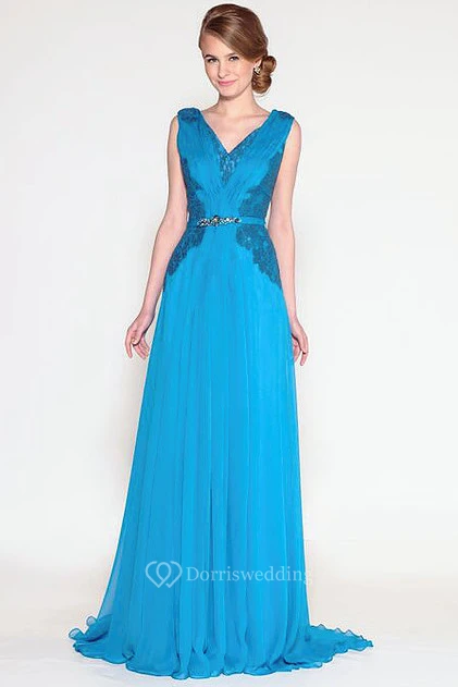 V-Neck Appliqued Maxi Sleeveless Chiffon Prom Dress With Waist Jewellery And Pleats
