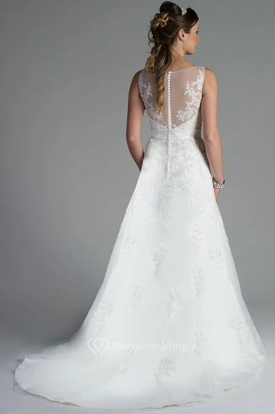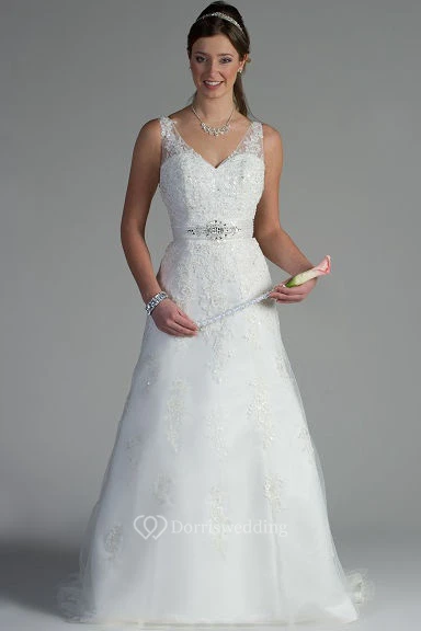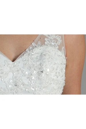 V Neck Appliqued Top A-Line Tulle Bridal Gown With Sequins And Crystals